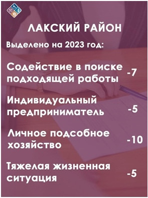 Проект «Социальный контракт», реализуемый Минтруда Дагестана, направлен на улучшение благосостояния жителей республики, находящихся в трудной жизненной ситуации. Напомним, что в 2022 году благодаря «Социальному контракту» около 7 тысячам малоимущих семей (или малоимущих одиноко проживающих граждан) граждан удалось оказать содействие по выходу из состояния бедности и улучшению своего материального благополучия. В 2023 году Республике Дагестан выделены средства на заключение 5 901 Социального контракта. Из них на поиск подходящей работы предусмотрено - 1 541, открытие собственного дела - 1 603, ведение личного подсобного хозяйства - 1400 и на выход из тяжелой жизненной ситуации – 1 357 социальных контрактов.