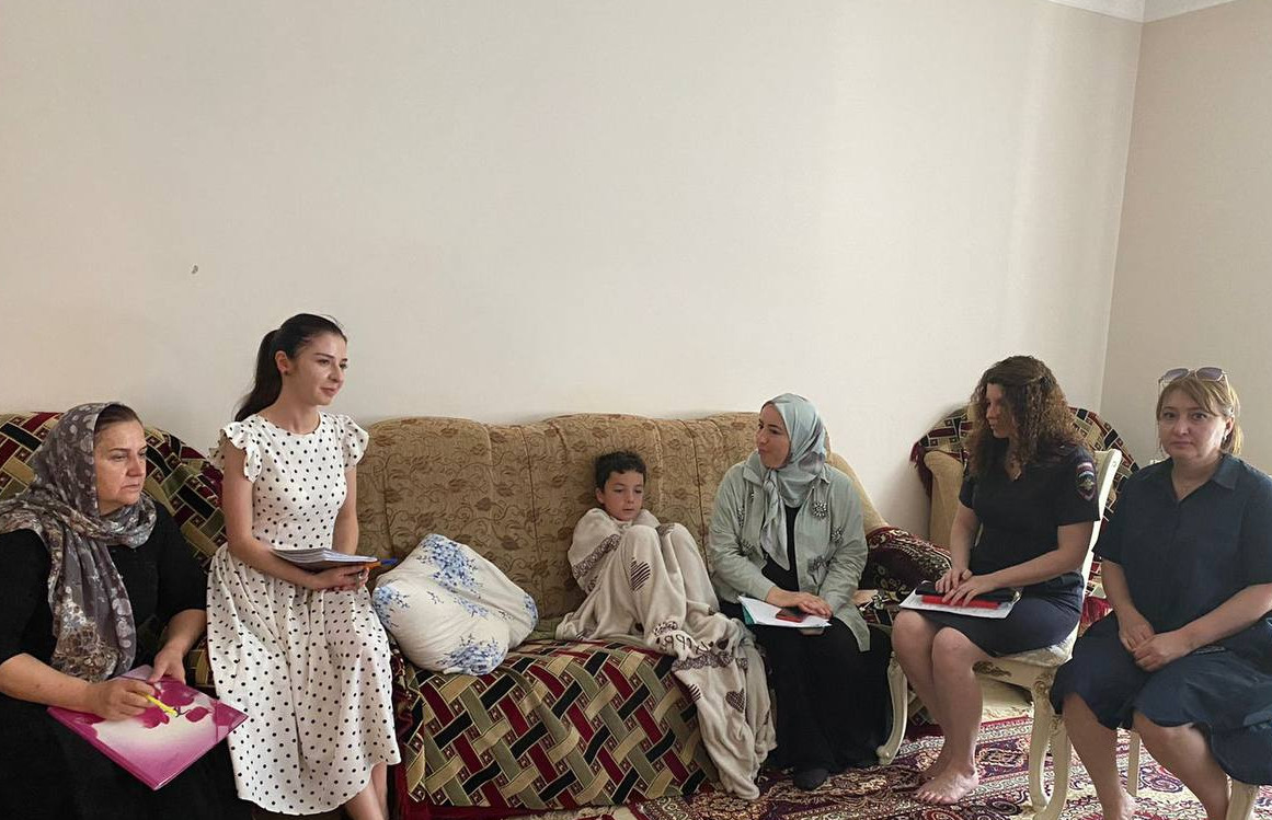 ?Психолог Отделения социального обслуживания семей и семей с детьми Темирханова З. С. совместно с Инспектором ПДН Магомедовой М. специалистом УСЗН, специалистом КДН еженедельно выезжают по семьям находящимся в СОП.