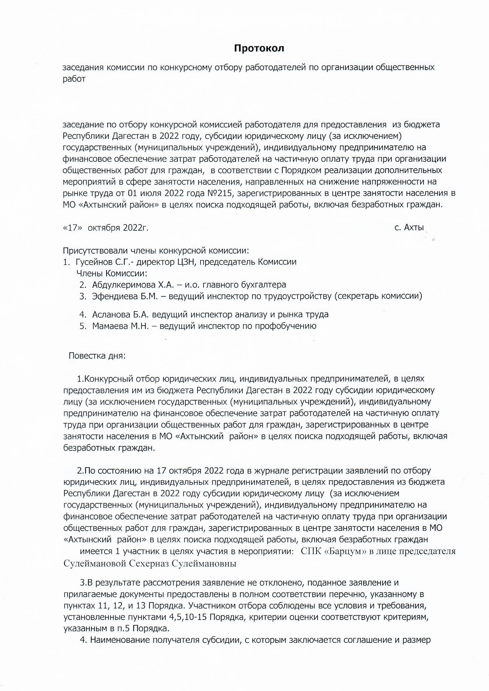 заседание по отбору конкурсной комиссией работодателя для предоставления из бюджета Республики Дагестан в 2022 году, субсидии юридическому лицу (за исключением) государственных (муниципальных учреждений), индивидуальному предпринимателю на финансовое обеспечение затрат работодателей на частичную оплату труда при организации общественных работ для граждан, в соответствии с Порядком реализации дополнительных мероприятий в сфере занятости населения, направленных на снижение напряженности на рынке труда от 01 июля 2022 года №215, зарегистрированных в центре занятости населения в МО «Ахтынский район» в целях поиска подходящей работы, включая безработных граждан.