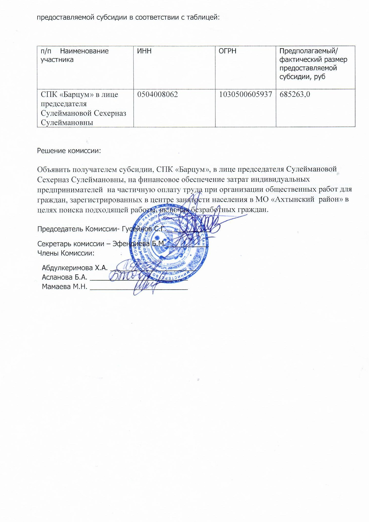 Объявить получателем субсидии, СПК «Барцум», в лице председателя Сулеймановой Сехерназ Сулеймановны, на финансовое обеспечение затрат индивидуальных предпринимателей на частичную оплату труда при организации общественных работ для граждан, зарегистрированных в центре занятости населения в МО «Ахтынский район» в целях поиска подходящей работы, включая безработных граждан.
