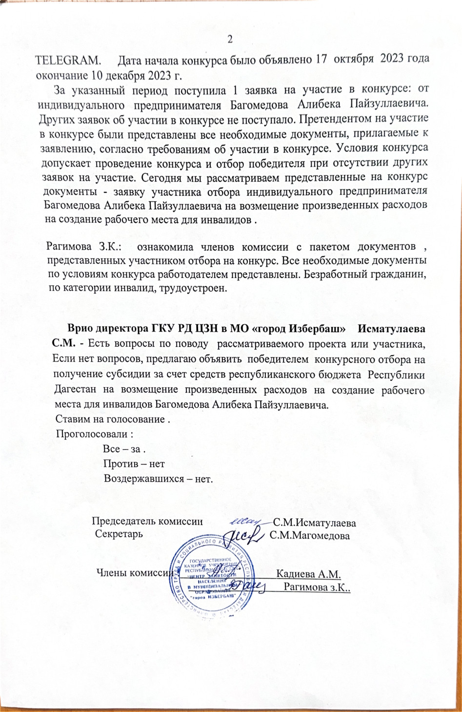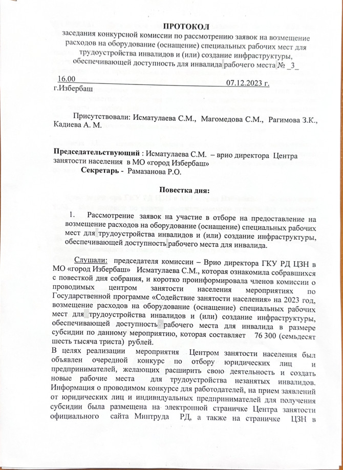 Протокол заседания конкурсной комиссии на предоставление субсидии работодателю на оборудование (оснащение) рабочих мест для инвалида