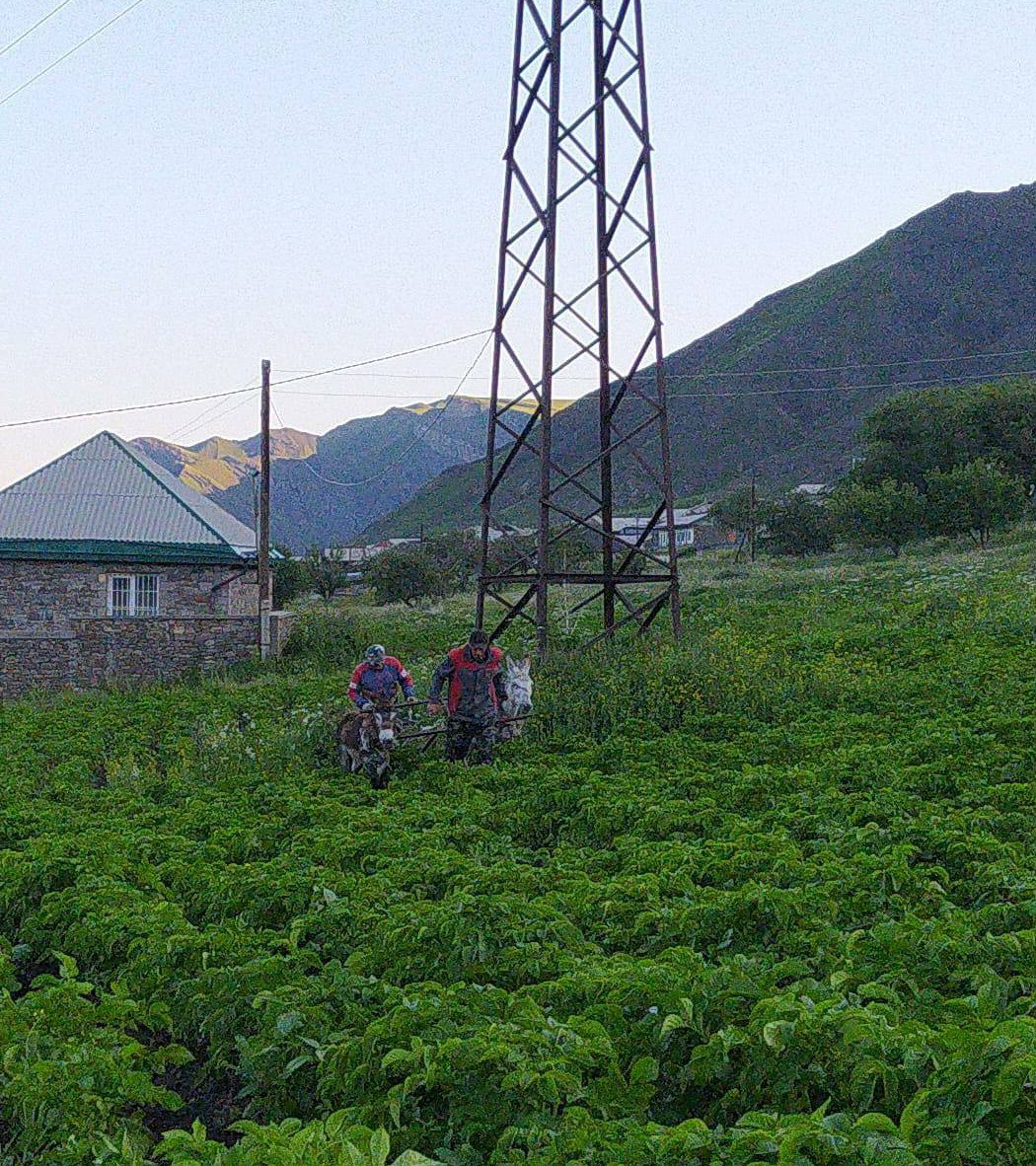 Здесь можно застать и редкий метод - окучивание картошки с помощью животных. Это когда запрягаются два ишака и тянут плуг. Сзади плуг держит и управляет один человек, а другой тянет невольных животных. Наверно, в некоторых других районах Дагестана тоже изредка можно встретить подобный способ.