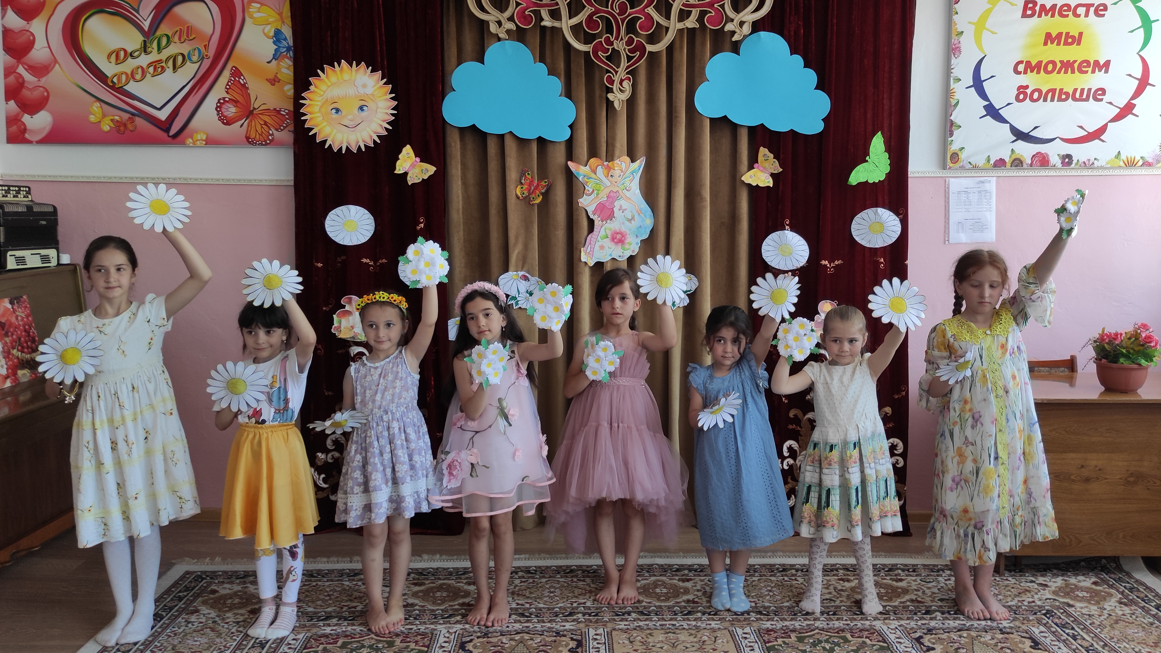 На праздник к ребятам пожаловали разноцветное Лето и три неразлучных друга - Солнышко, Ветерок и Дождик, которые рассказали о себе много интересного.