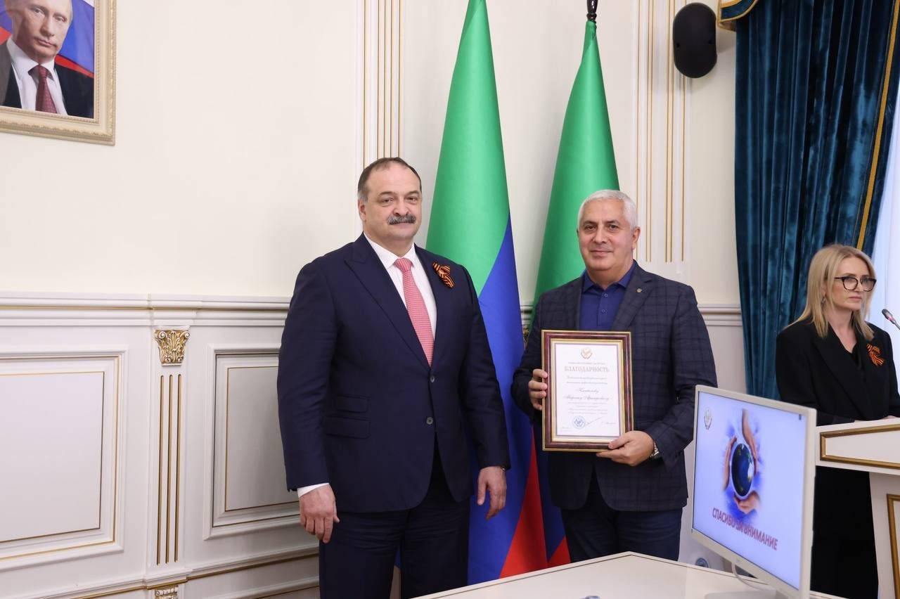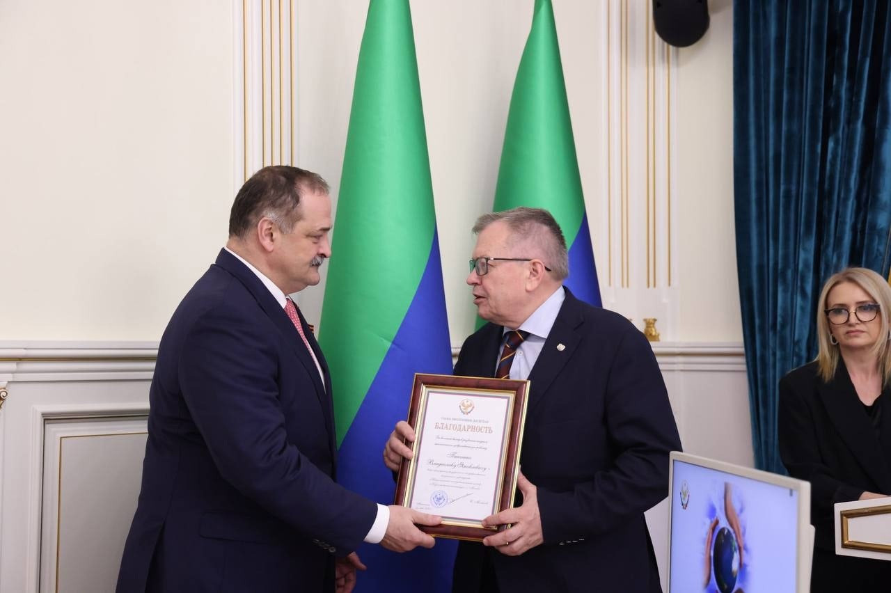 Сергей Меликов вручил Михаилу Ковальчуку Почетную грамоту Республики Дагестан за выдающиеся заслуги в области научно-исследовательской деятельности и многолетнюю плодотворную работу.