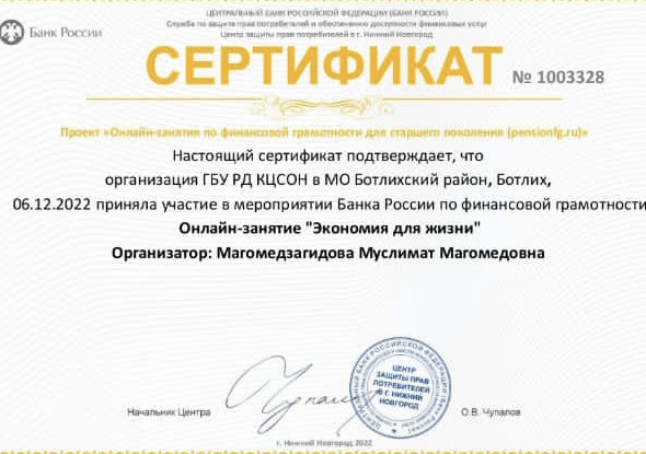 В соответствии с обращением Центрального Банка Российской Федерации (Банк России) Южного главного управления Отделение Национального банка по Республике Дагестан в ГБУ РД КЦСОН в МО «Ботлихский район» 6 декабря 2022г. 11: 00ч. согласно расписанию было организованно онлайн - занятие « Финансовая грамотность для старшего возраста»(PensionFG) для граждан пенсионного возраста и социальных работников. 1. На занятие присутствовали 5 человек пенсионеров (возраст 36-54 лет) и длилось 45 минут на тему «Экономия для жизни». Организация получила сертификат на имя организатора, собравшего группу, Магомедзагидова Муслимат Магомедовна.