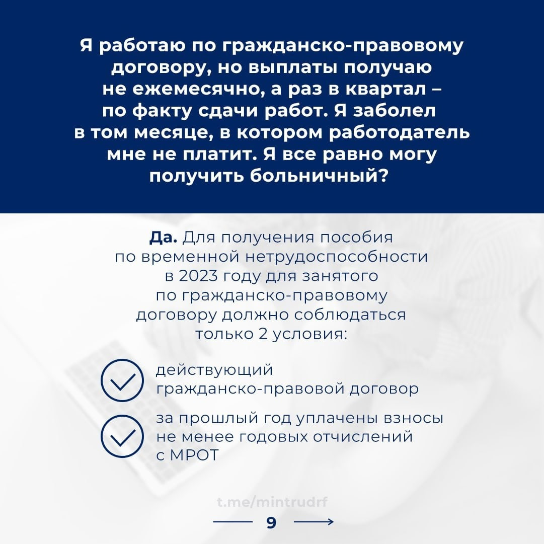 Подробнее обо всех вопросах, связанных с больничными для занятых по гражданско-правовым договорам — в наших карточках