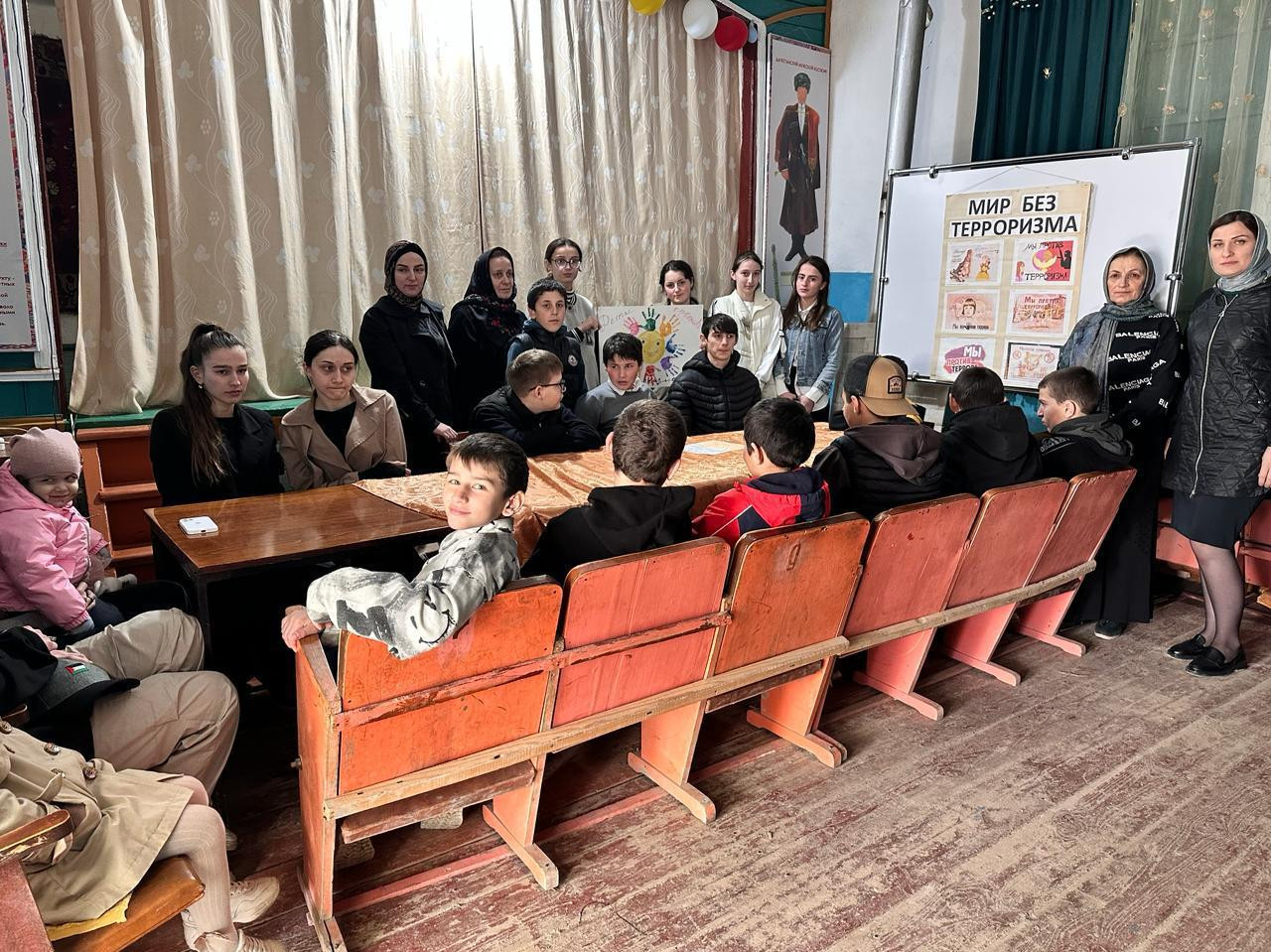 Специалист по работе с семьей, Багомедова З., и медицинская сестра по массажу Айгумова Э. провели беседу с детьми на тему "Мир без терроризма".