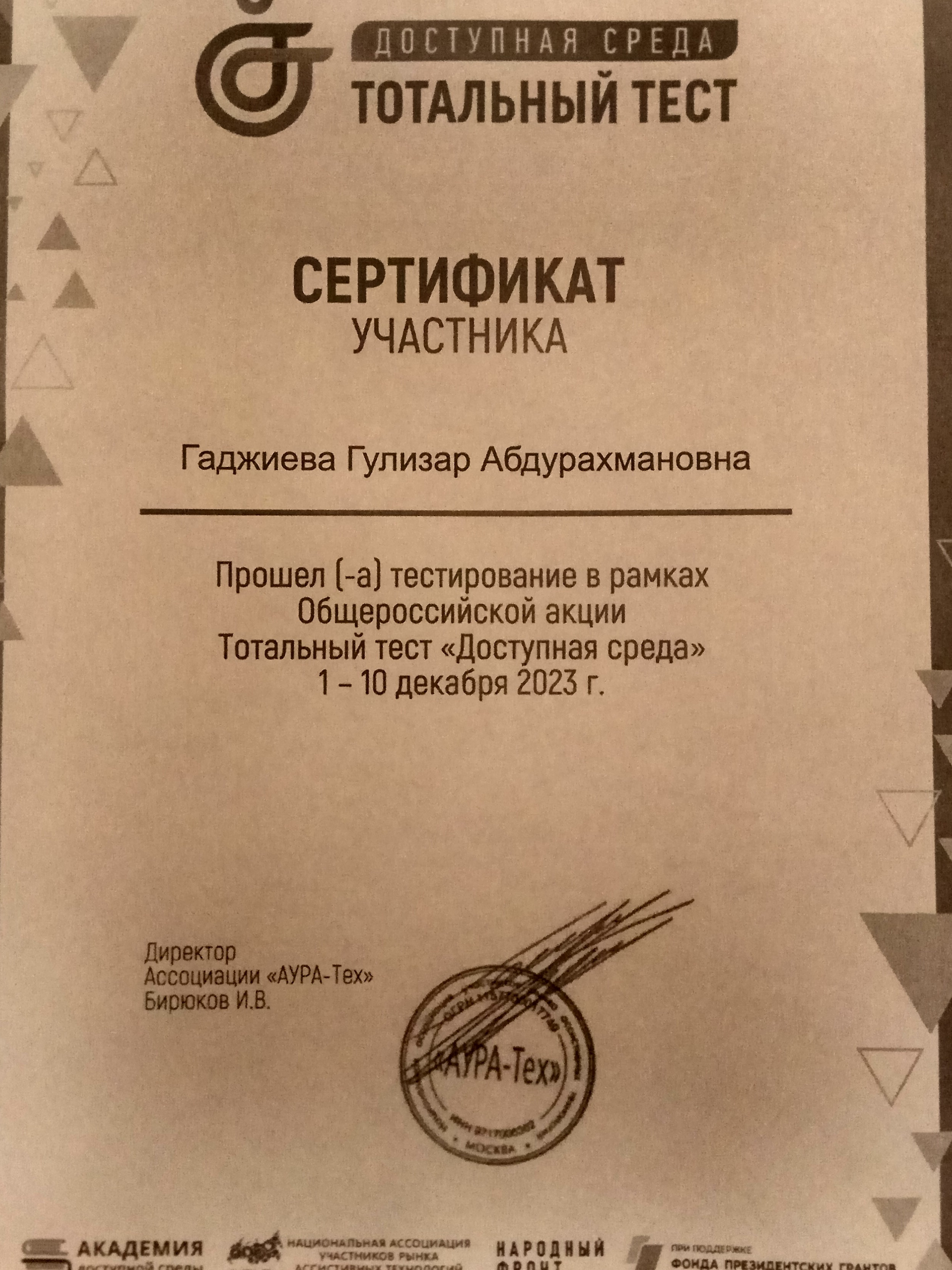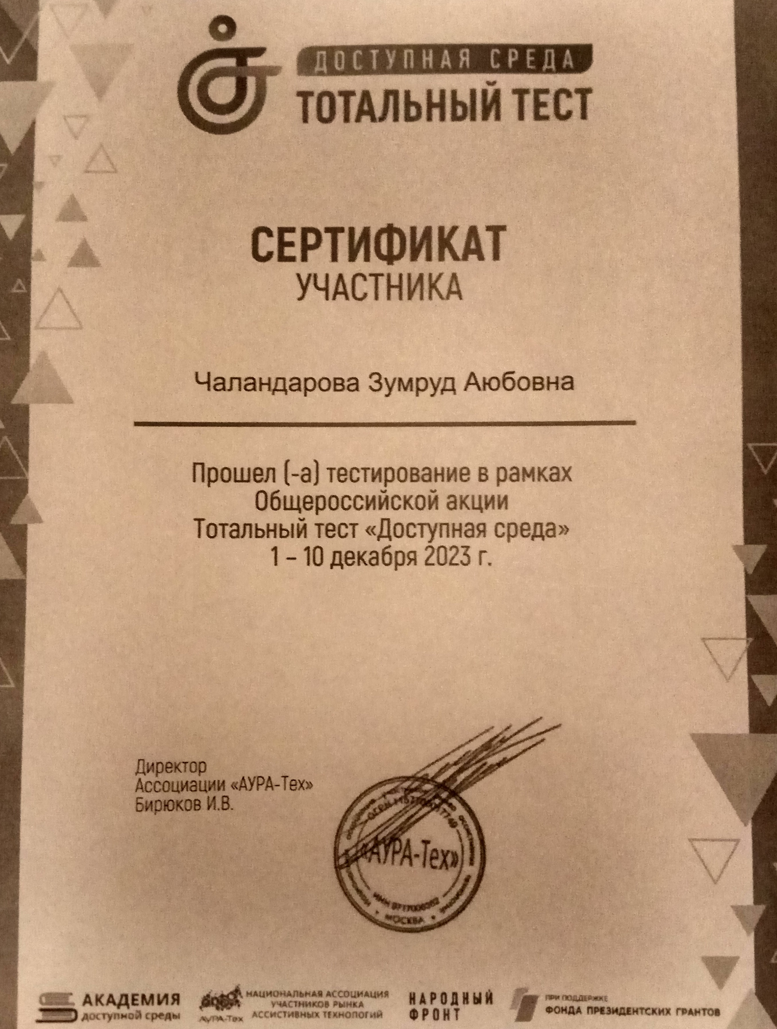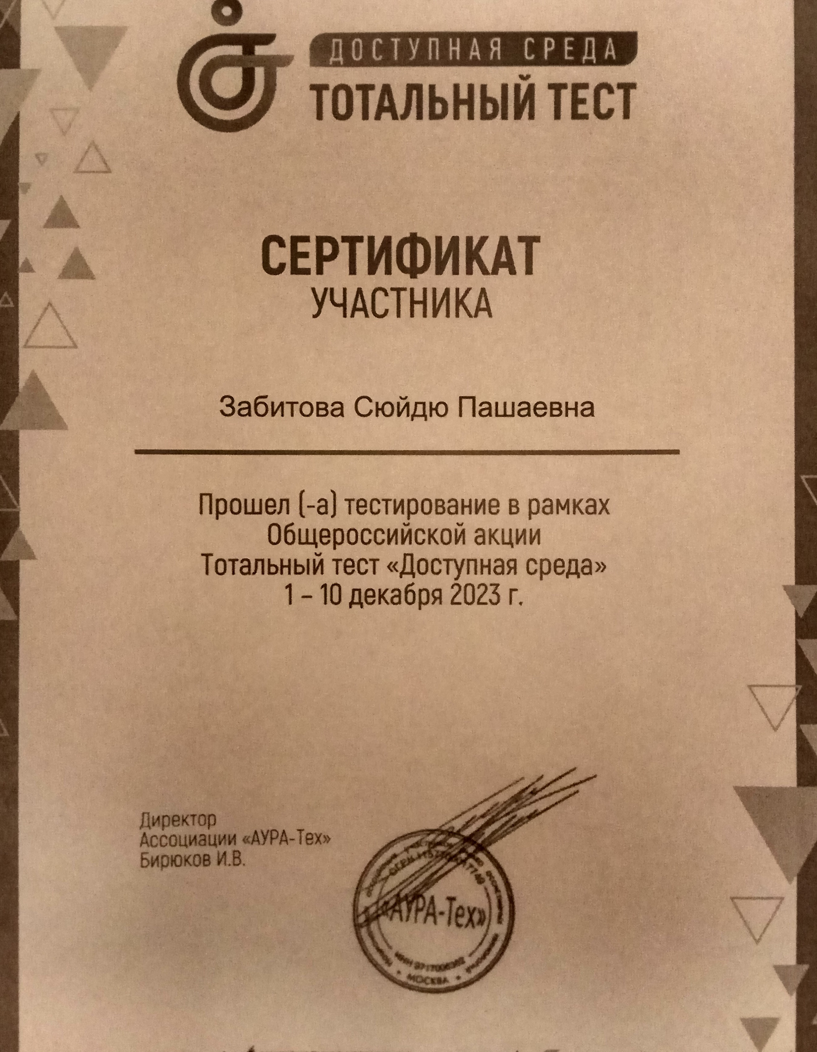 Работники центр приняли участие в Тотальном тестировании "Доступная среда". 1 декабря 2023 года, накануне Международного дня инвалидов, стартует Общероссийская акция Тотальный тест «Доступная среда», призванная привлечь внимание граждан России к правам и потребностям людей с инвалидностью. Тестирование традиционно проводится в онлайн-формате. Также по итогам мероприятия пройдёт публичный разбор вопросов и тренинг с участием ведущих экспертов. Участники мероприятия также получат возможность подготовиться к тестированию и бесплатно пройти обучающие курсы от ведущих российских экспертов в области доступной среды, инклюзии и создания доступных цифровых сервисов для людей с инвалидностью. Спикерами Тотального теста «Доступная среда» выступят известные государственные деятели, лидеры общественного мнения, представители культуры и искусства. Организаторы акции – Народный фронт, Академия доступной среды и Ассоциация «АУРА-Тех».
