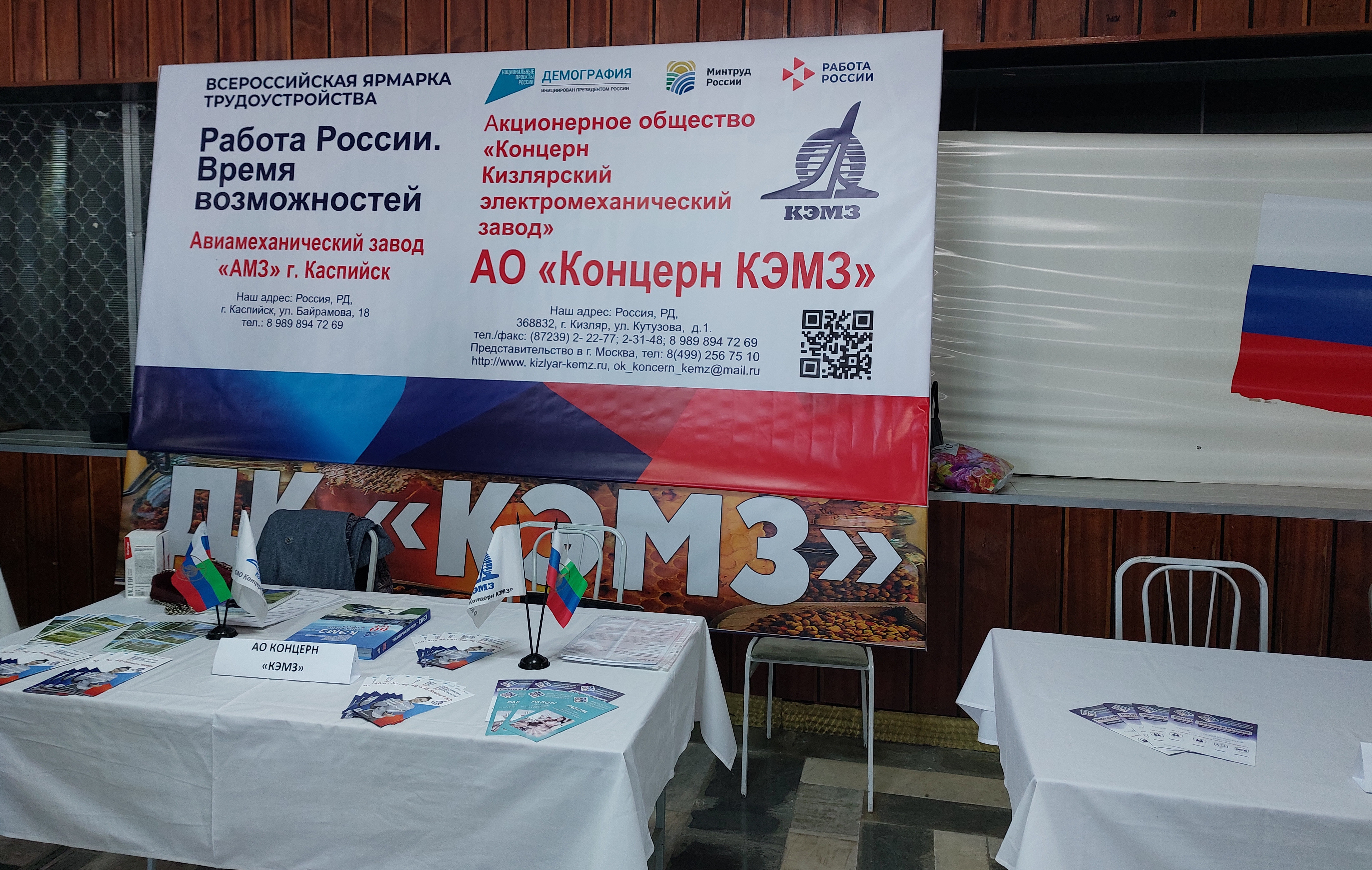 На базе Кизлярского электромеханического завода Центром занятости населения Минтруда РД в МО «город Кизляр» совместно с АО «Концерн КЭМЗ» проведена ярмарка вакансий для безработных граждан и незанятого населения города Кизляра и Кизлярского района. Организована она в рамках подготовки к Всероссийской ярмарке трудоустройства «Работа России. Время возможностей».