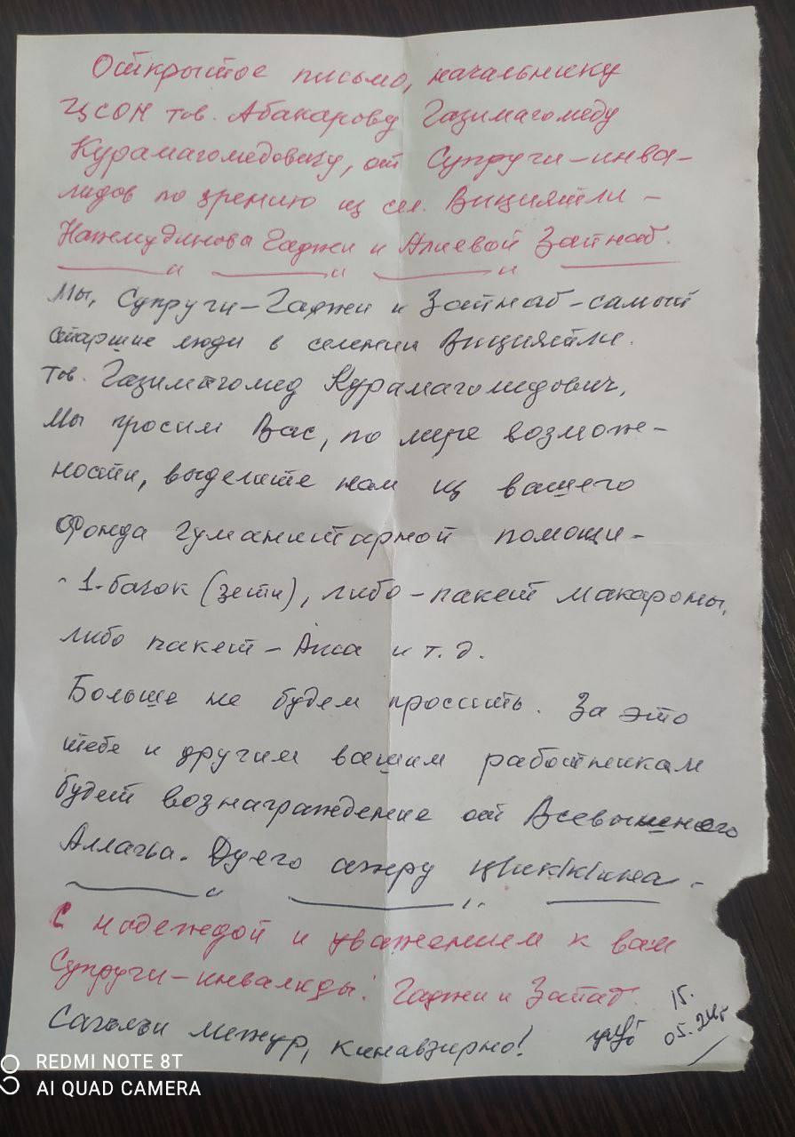 В Государственное бюджетное учреждение Республики Дагестан Центр социального обслуживания населения в МО "Цунтинский район" поступило открытое письмо от старейшего жителя села Вицятли, Нажмудинова Гаджи, с просьбой о помощи для его семьи. Его супруга, Алиева Зайнаб, является одной из наших подопечных.