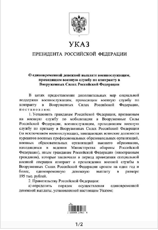 - Установить гражданам Российской Федерации, призванным на военную службу по мобилизации в Вооруженные Силы Российской Федерации, военнослужащим, проходившим военную службу по призыву в Вооруженных Силах Российской Федерации (за исключением военнослужащих, замещающих воинские должности курсантов военных профессиональных образовательных организаций, военных образовательных организаций высшего образования, находящихся в ведении Министерства обороны Российской Федерации), иным гражданам Российской Федерации (иностранным гражданам), которые заключили в период проведения специальной военной операции контракт о прохождении военной службы в Вооруженных Силах Российской Федерации сроком на один год и более, единовременную денежную выплату в размере 195 тыс.рублей.