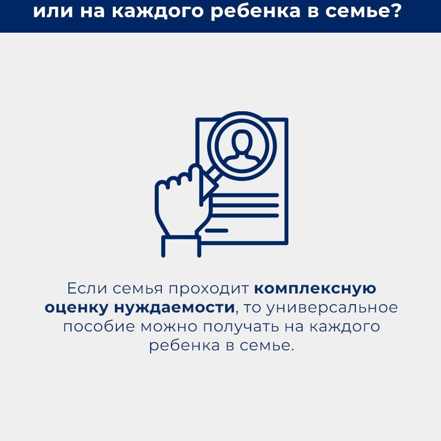 Универсальное пособие назначается с применением комплексной оценки нуждаемости, как сейчас уже назначаются выплаты на детей от 3 до 8 лет и от 8 до 17 лет.