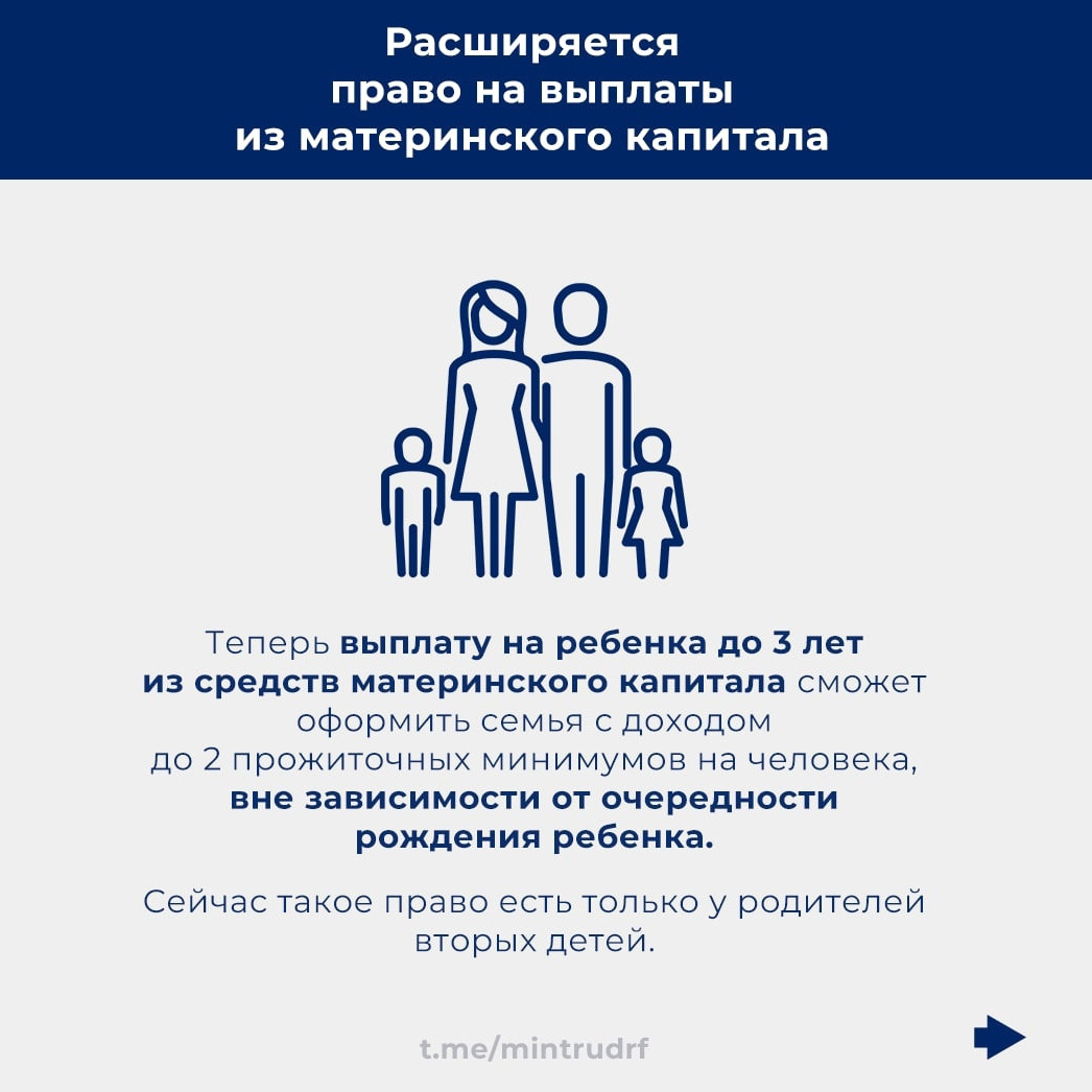 Дополнительно устанавливается возможность оформить выплату из материнского капитала для всех детей до 3 лет, вне зависимости от очередности рождения, если доход семьи — меньше двух прожиточных минимумов на человека. Выплата из материнского капитала назначается без комплексной оценки нуждаемости! В карточках рассказываем главное о новом универсальном пособии