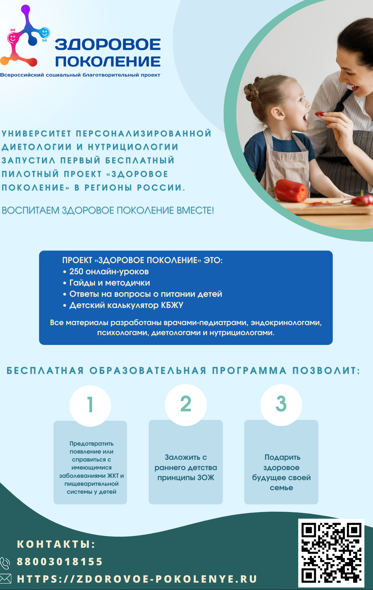 в рамках реализуемого Университетом персонализированной диетологии и нутрициологии первого благотворительного  пилотного проекта «Здоровое поколение», запущенного в регионы России. Проект для родителей подрастающего поколения; бабушек и дедушек, принимающих активное участие в воспитании внуков.