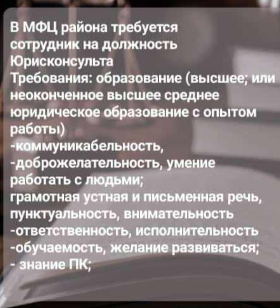 в ФГАУ «МФЦ в РД» по Лакскому району требуется работник на должность юрисконсульта.