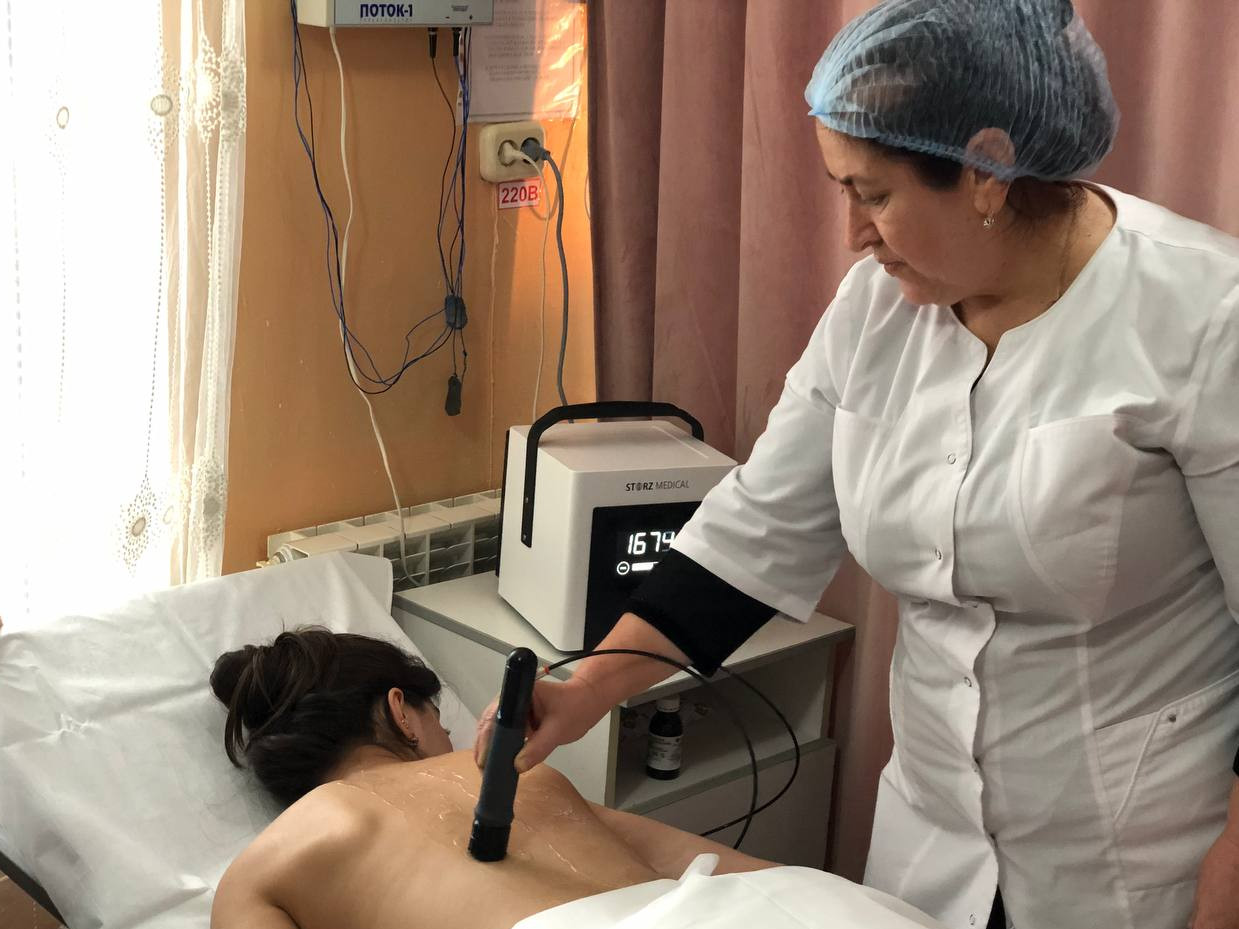 Ударно-волновая терапия - это акустические низкочастотные волны, которые путём создания искусственного давления совершают удары по насадке, а насадка создает акустическую волну, которая проникает в ткани с частотой до 22 герц, создают эффект массажа. Тем самым размягчает плотную структуру ткани, значит снимает спазм мышц. В процессе чего усиливается кровоток в тканях и снимается воспалительный процесс