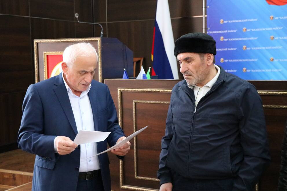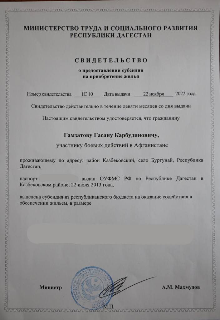15 декабря первый заместитель главы администрации МР «Казбековский район» Ильяс Шабазов вручил жилищный сертификат ветерану боевых действий в Афганистане, воину-интернационалисту. Свидетельство о предоставлении безвозмездной субсидии порядка 2 млн. рублей на приобретение жилья размером не менее 36 кв.м. получил житель с.Буртунай Гасан Гамзатов. В церемонии вручения приняли участие все члены семьи Гамзатова, начальник районного управления социальной защиты населения Сулейман Динаев и замруководителя аппарата администрации МР- начальник отдела канцелярии Марьям-Асият Гамзатова.Ильяс Шабазов отметил, что благодаря увеличению стоимости квадратного метра, руководству района удалось увеличить нормативы для выдачи сертификата с учетом данного повышения. Добавим, что на очереди для получения подобных сертификатов числятся еще 3 граждан.