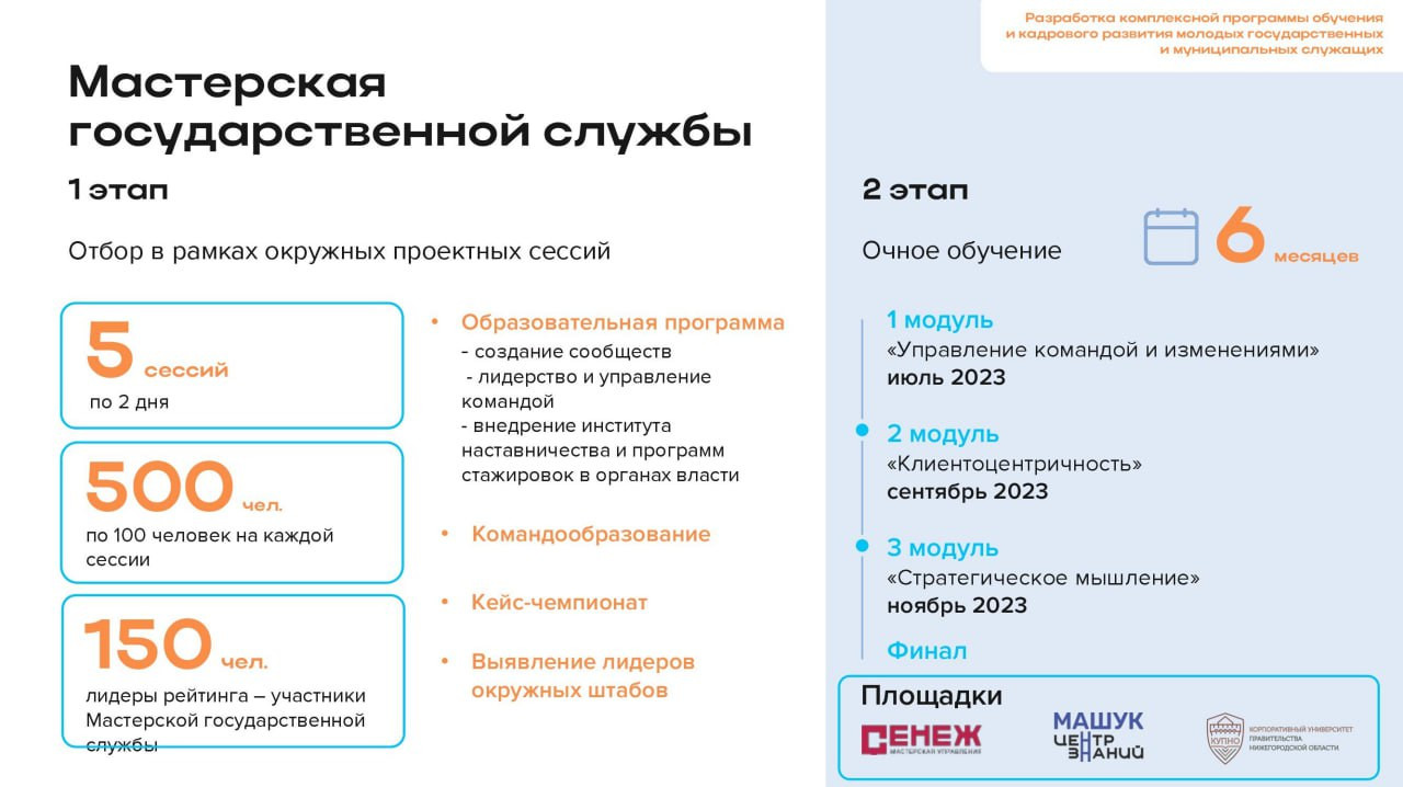 Мастерская государственной службы – образовательная программа для молодых государственных и муниципальных служащих в дистанционном и очном форматах;
