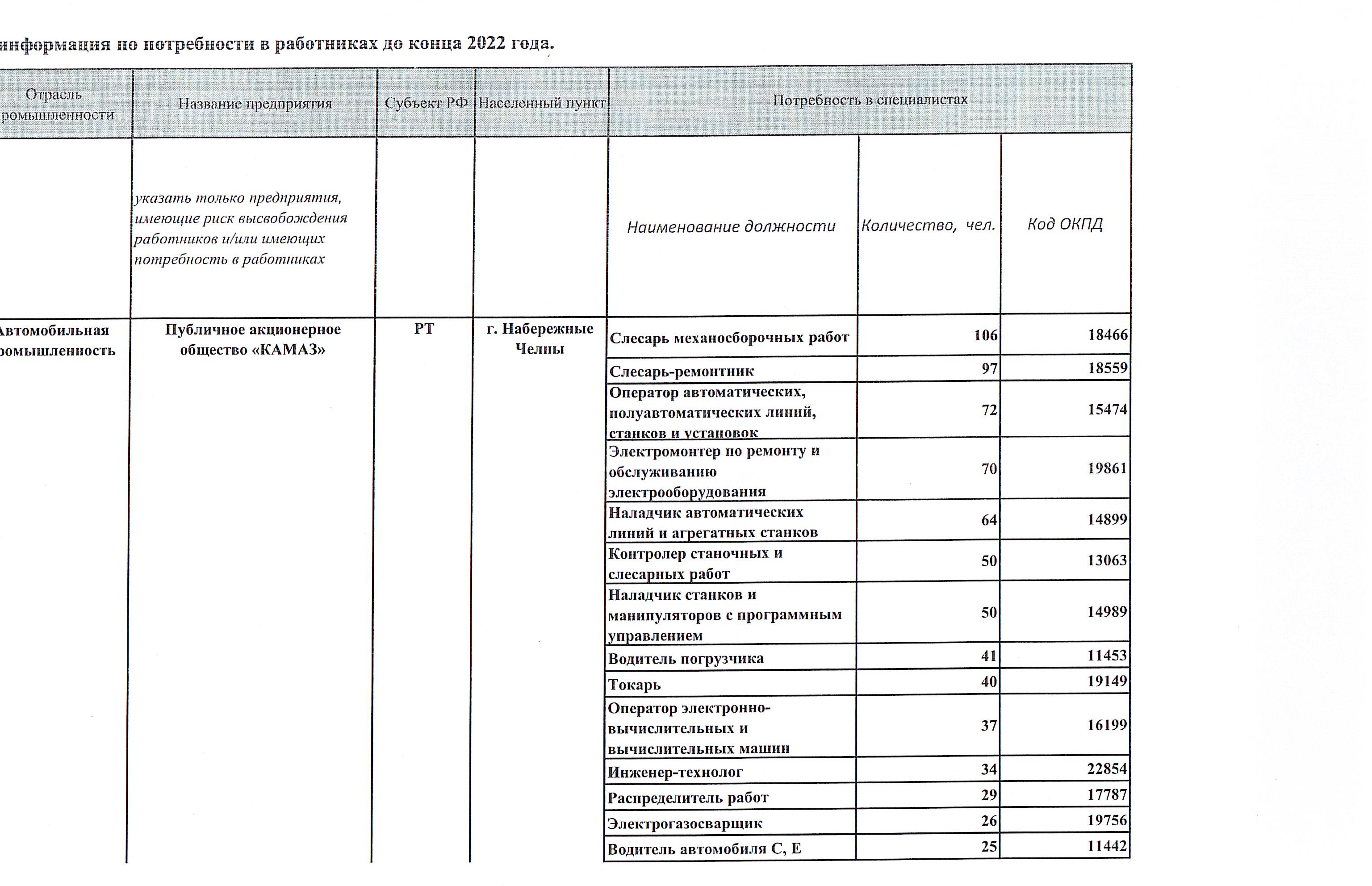 В этой связи ПАО «КАМАЗ» оказывает содействие в подборе и направлении персонала для работы на заводах. В свою очередь ПАО «КАМАЗ» готово предложить рабочие места с достойными условиями труда и заработной платы на заводах в г. Набережные Челны. За вновь принятыми работниками без соответствующей квалификации будет закреплен наставник для обучения безопасным приемам труда и ознакомлен с оборудованием.