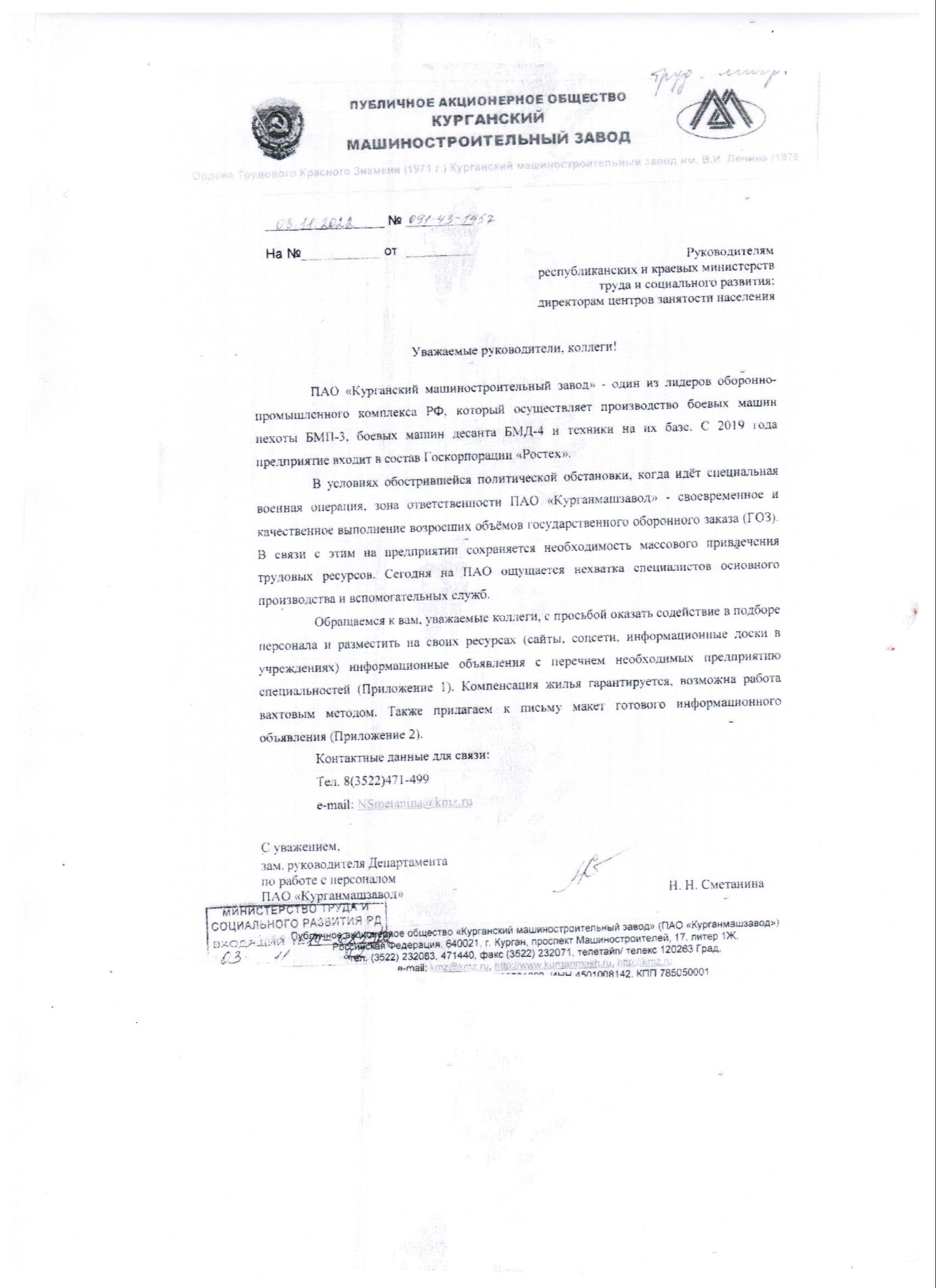 В целях реализации мероприятий, связанных с направлением для трудоустройства безработных и незанятых граждан за пределы Республики Дагестан Центр занятости населения в МО "Хасавюртовский район" информирует безработных и незанятых граждан Хасавюртовского района о потребности в работниках, имеющихся в ПАО "Курганский машиностроительный завод" и возможности трудоустройства на указанном предприятии. Компенсация жилья гарантируется, возможна работа вахтовым методом. Контактные данные для связи тел. 8(3522)471-499, 8(3522)471-275, 8(3522)471-907.
