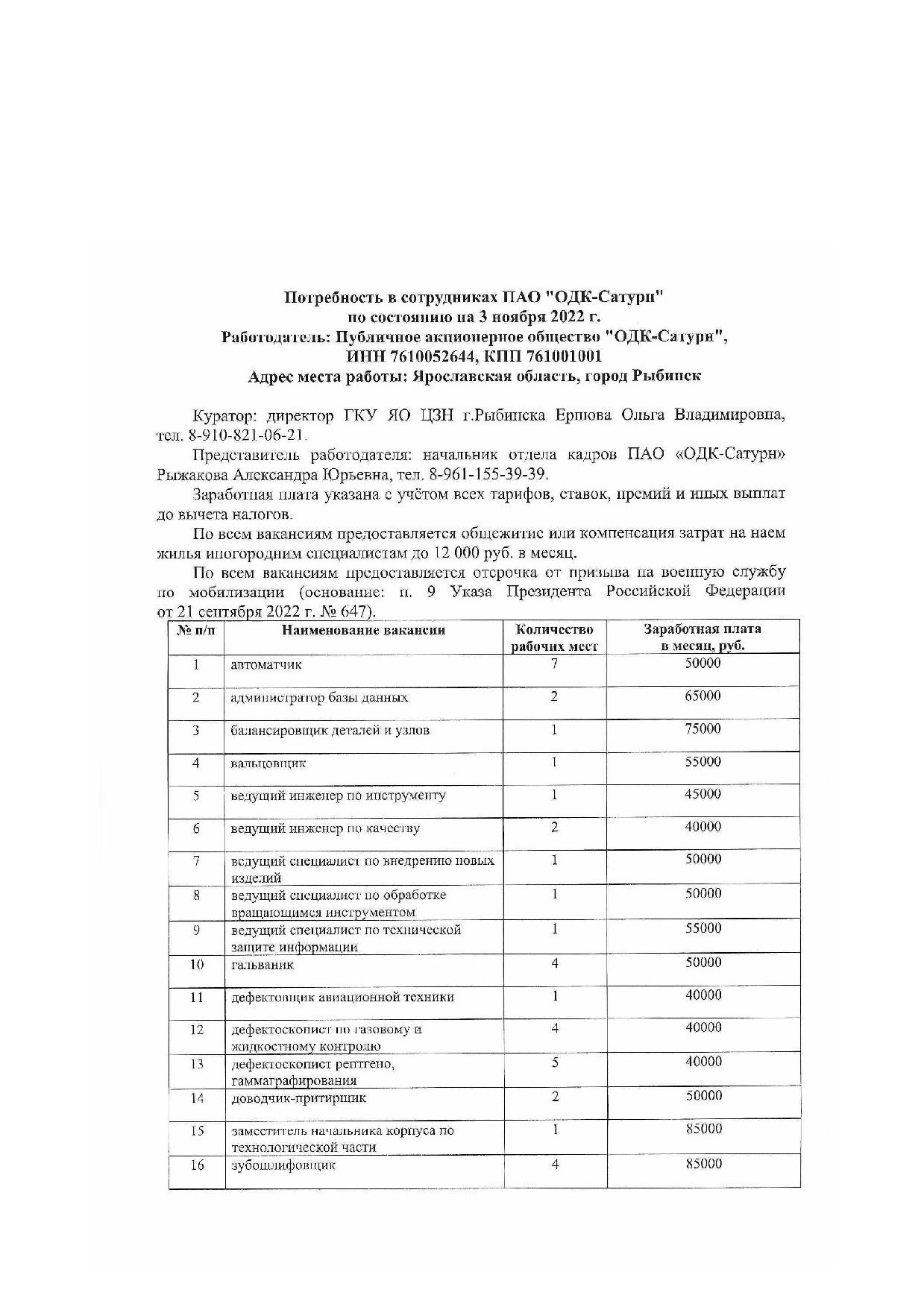 Информация для безработных и незанятых граждан, состоящих на учете в центре занятости, о вакансиях в ПАО «ОДК-Сатурн», и для  выпускников профессиональных образовательных организаций о возможностях трудоустройства в ПАО «ОДК-Сатурн»;