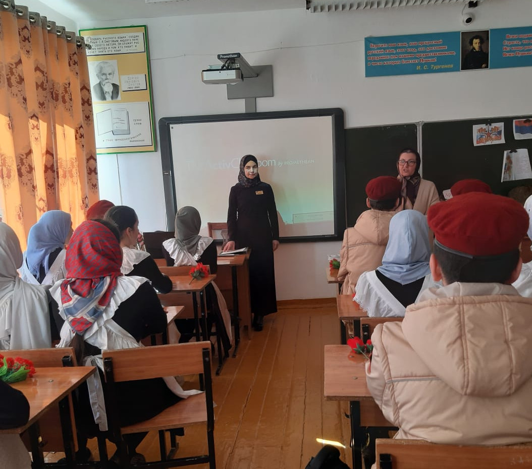 21 февраля специалисты ГКУ РД ЦЗН в МО «Казбековский район» Магдиханова М.А. и Абдулхамидова З.З. в рамках проведения военно-профориетационных мероприятий среди молодежи «Военная профессия-достойный выбор» совместно с педагогами Гунийской МКОУ «Гимназия культуры мира» им. Нуцалова К.Г. Дадаевой М, Ахмедовой А . провели для учащихся 9-х классов классный час «Есть такая профессия –Родину защищать». Организаторы мероприятия рассказывали учащимся о профессии военного, какими качествами он должен обладать; о славных традициях Российской армии - любовь к земле предков, к своему Отечеству, постоянная готовность выступить на его защиту; верность Военной присяге, массовый героизм и др.;