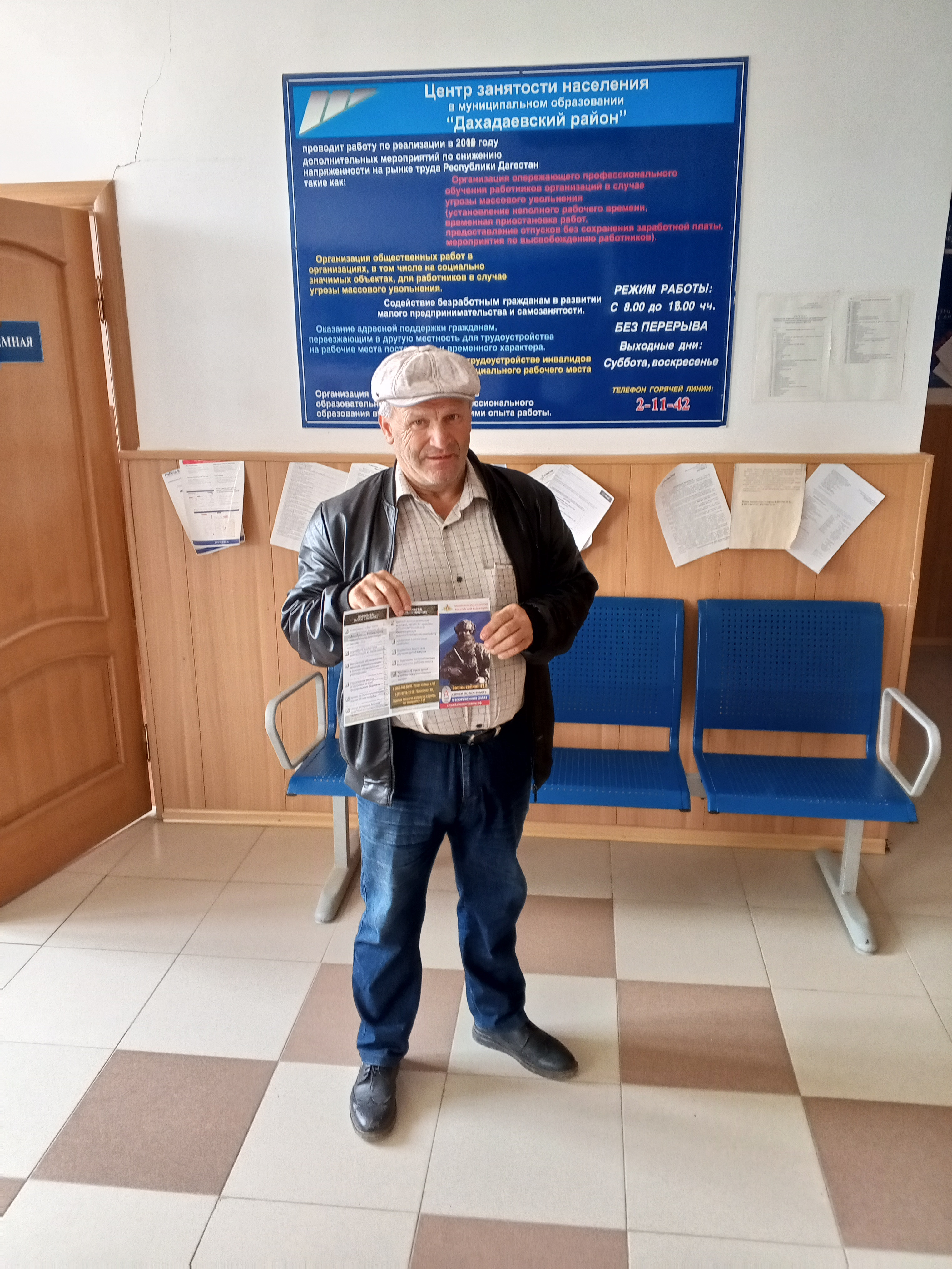 Сегодня, 21.05.2024г. в Центре занятости населения ГКУ РД ЦЗН в МО "Дахадаевский район" прошла встреча с безработными гражданами и гражданами ищущими работу. Цель встречи было информирование об условиях поступления на службу по контракту. На мероприятии присутствовала помощник начальника Военного Комиссариата Кайтагского и Дахадаевского районов Магомедов Г. который рассказал о службе в армии, воинской обязанности, а также плюсах и минусах, гарантиях и привилегиях службы по контракту, о требованиях к кандидатам, выплаты. Также на мероприятии присутствовала представитель УСЗН Магомедова У.М., которая озвучила социальные выплаты лицам, заключающим военный контракт. Инспектор по анализу рынка труда Бегов К.А. проинформировал безработных о военной профессии, все присутствующие получили профконсультацию. Целью таких мероприятий является, развитие гордости и патриотического воспитания молодежи, безработных и ищущих работу граждан, понимания необходимости защищать Родину в случае опасности извне....
