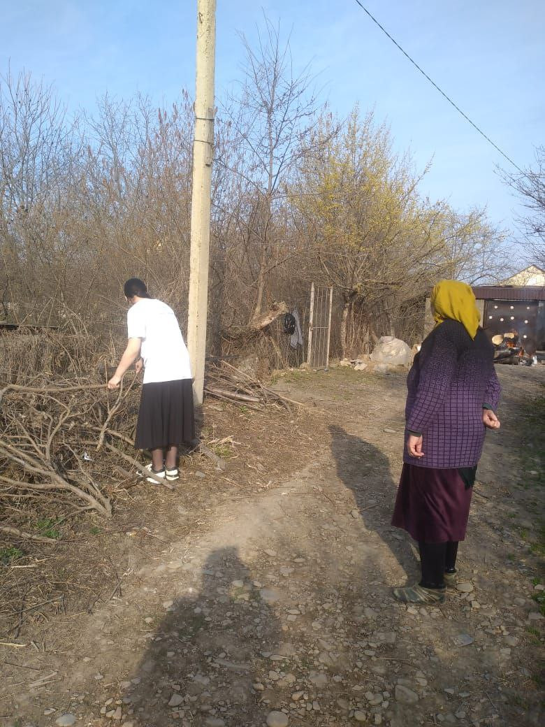 Волонтеры КЦСОН Сулейман-Стальского района оказывают помощь подопечной Джабраиловой М. в сборе сухих веток, и очистке приусадебного участка от мусора.