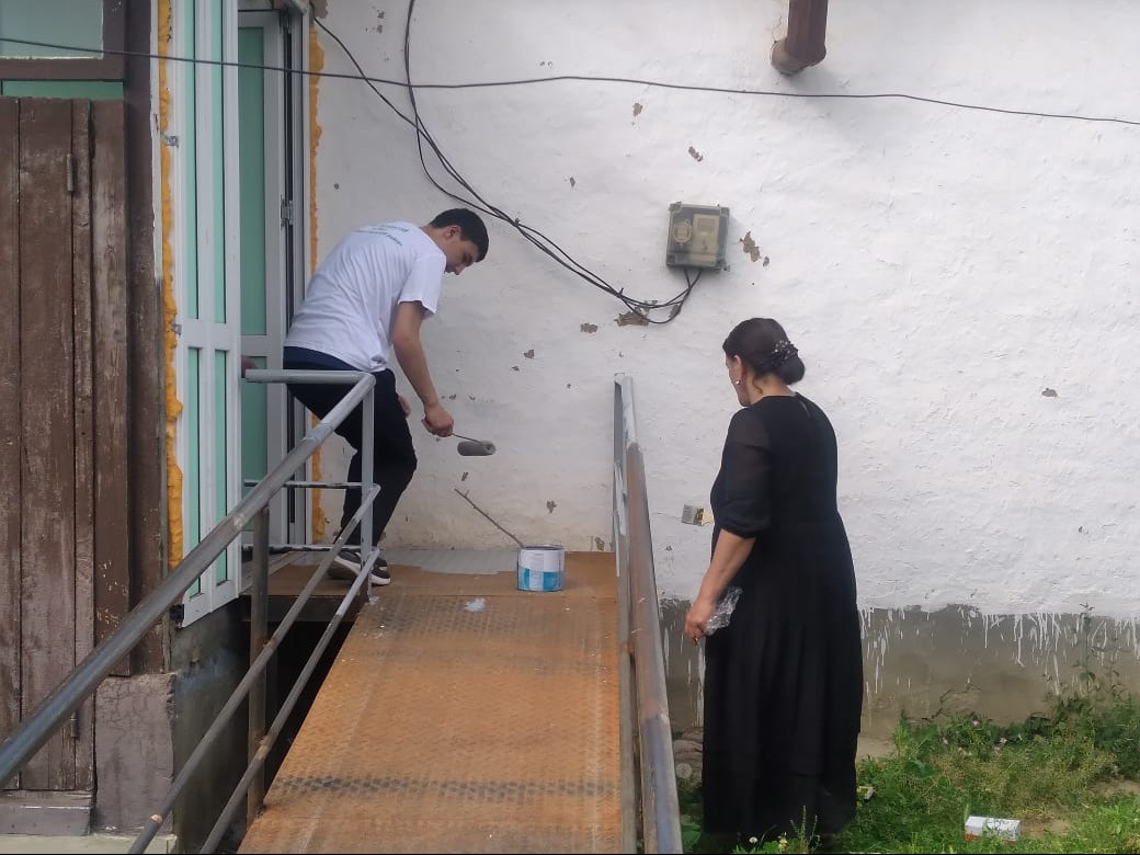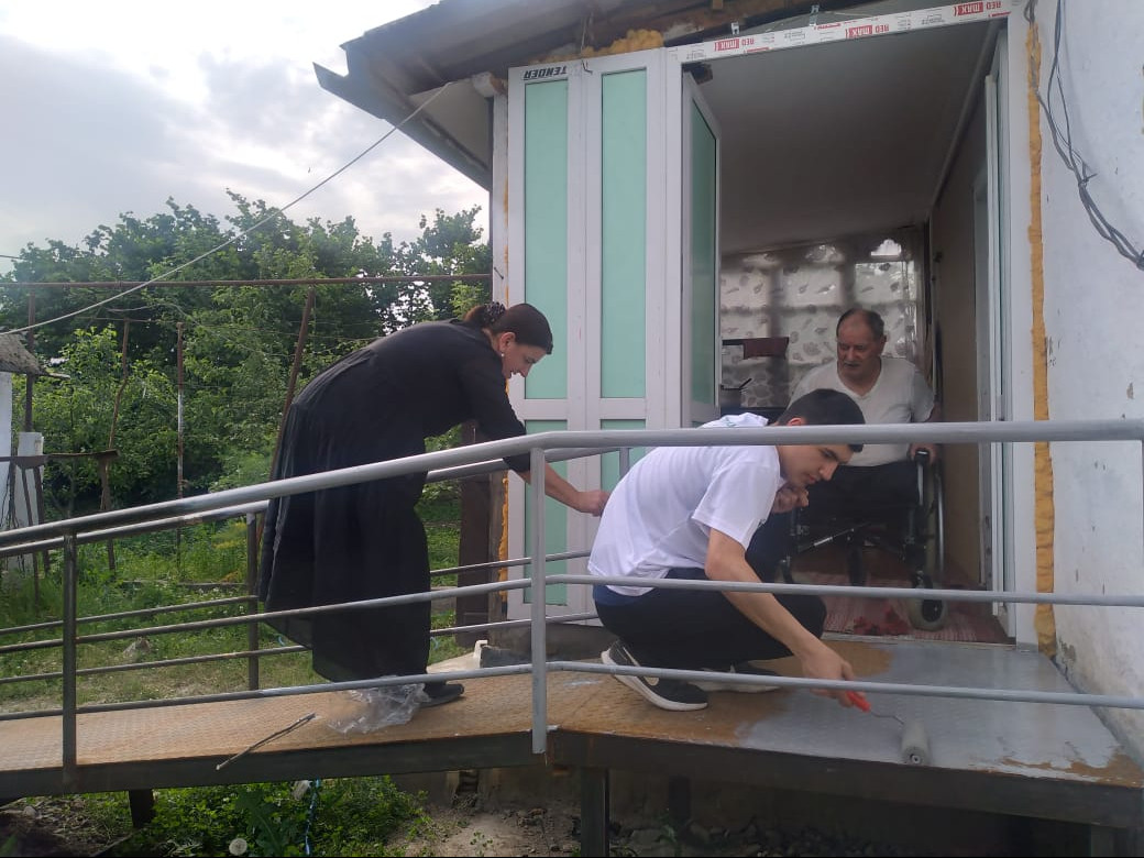 Специалист отделения социального обслуживания на дому граждан пожилого возраста и инвалидов №5 Эльвира Алахкулиева совместно с волонтёрами центра по просьбе подопечного Мехти Джамалдинова покрасили изготовленный раннее пандус.