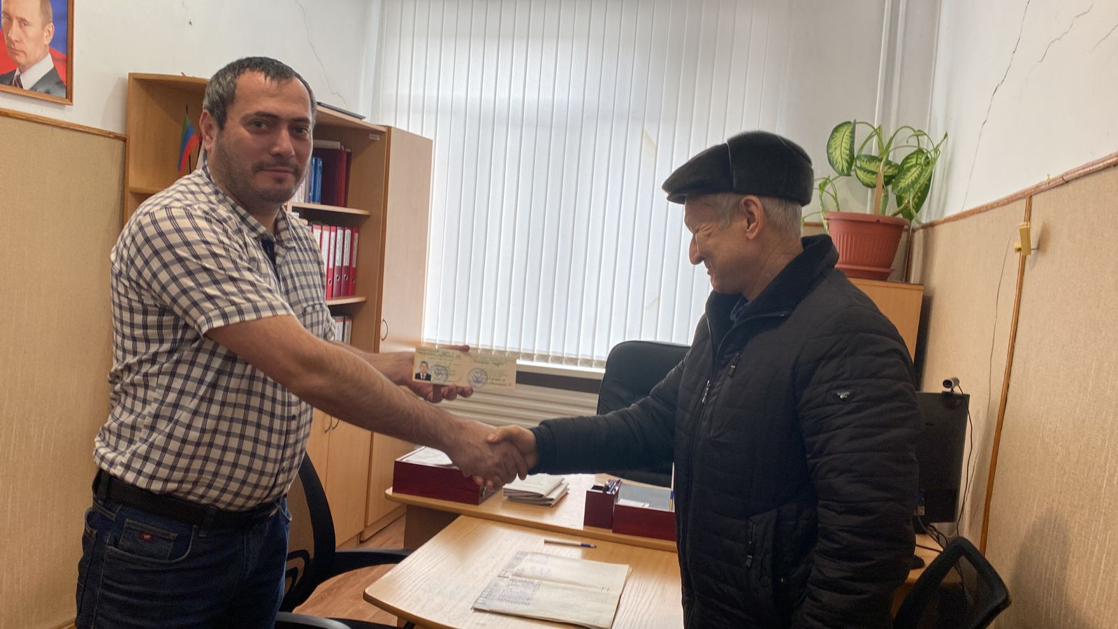 Директор ГКУ РД УСЗН в МО «Тарумовский район» М.Г.Гаджиев вручил удостоверения ветерана труда жителям села Новодмитриевка Отегенову Муратали Кургановичу и села Тарумовка Сулейманову Рашидхану Рамазановичу