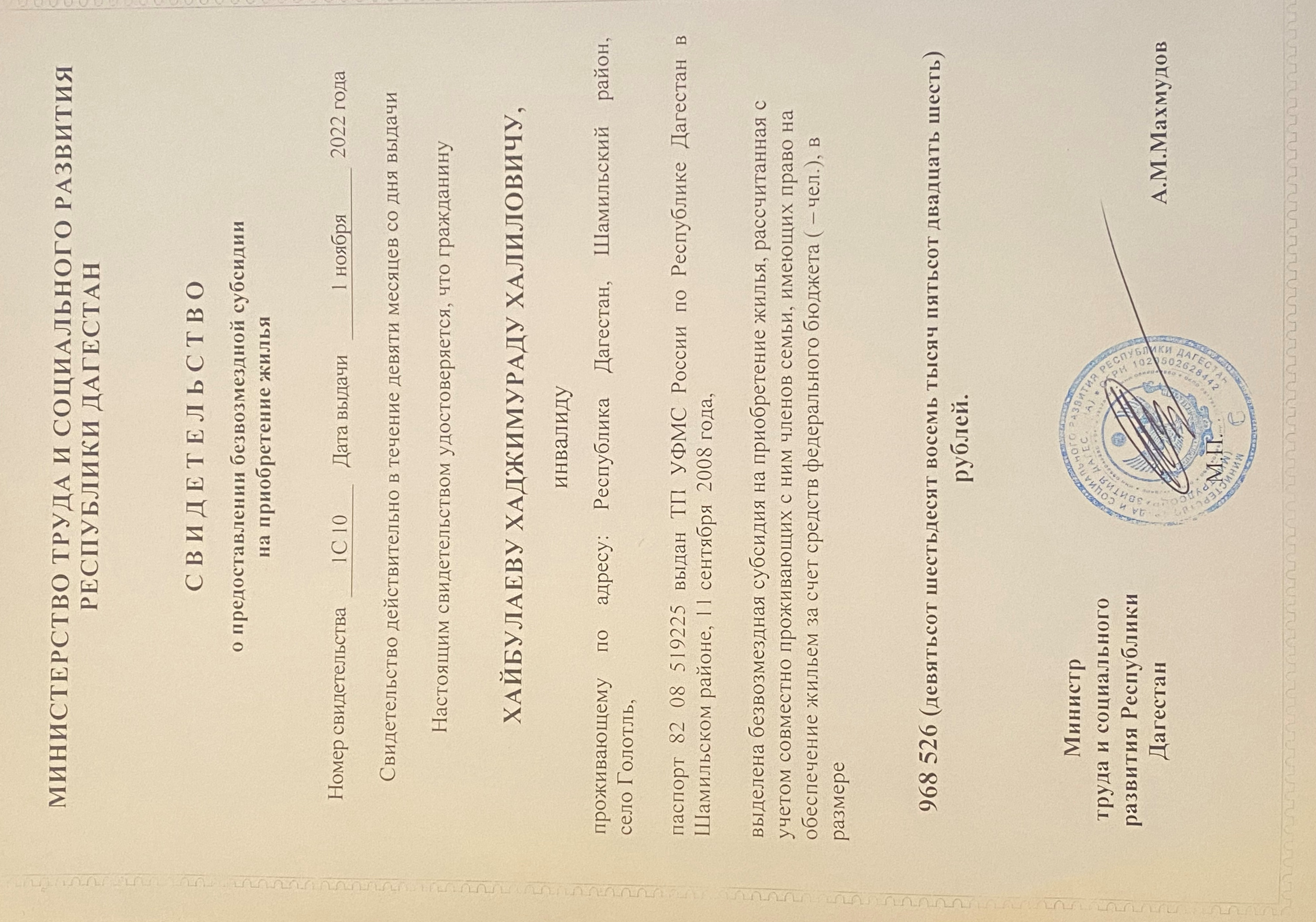 25 ноября 2022 года в ГКУ РД УСЗН в МО «Шамильский район» прошло вручение жилищного сертификата инвалиду Хайбулаеву Хаджимураду Халиловичу проживающего в с.Голотль. Поздравил и вручил жилищный сертификат директор ГКУ РД УСЗН в МО «Шамильский район» Магомедов Магомедхабиб Султангусенович. Безвозмездная субсидия на улучшение жилищных условий выделена в соответствии с Постановлением Правительства РД от 23.12.2007 г. за № 348 «О форме и порядке предоставления нуждающимся в улучшении жилищных условий и вставших на учёт до 01.01.2005 г. ветеранам, инвалидам и семьям, имеющим детей – инвалидов, безвозмездной субсидии на приобретение жилья».