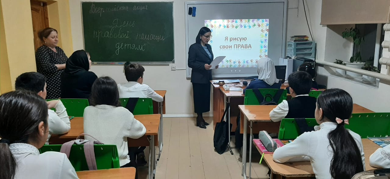В соответствии с Планом мероприятий Министерство труда и социального развития РД по проведению Всероссийского дня правовой помощи детям ГБУ РД КЦСОН в МО «Кайтагский район» Юрисконсульт Ашурбекова М.Г. провела мероприятие 16 ноября среди учащихся пятых и шестых классов МКОУ «Маджалисская СОШ №1». Детям был показан ролик « Я и мои права», «Я рисую свои права», «Конвенция о правах ребенка». В конце мероприятия детям раздали буклеты и информационные материалы «Конвенция о правах ребенка», «Права и обязанности подростка». На протяжении всего мероприятия дети активно участвовали, усвоили теорию, поняли для чего нужны права и как сделать так, чтобы их не нарушали.