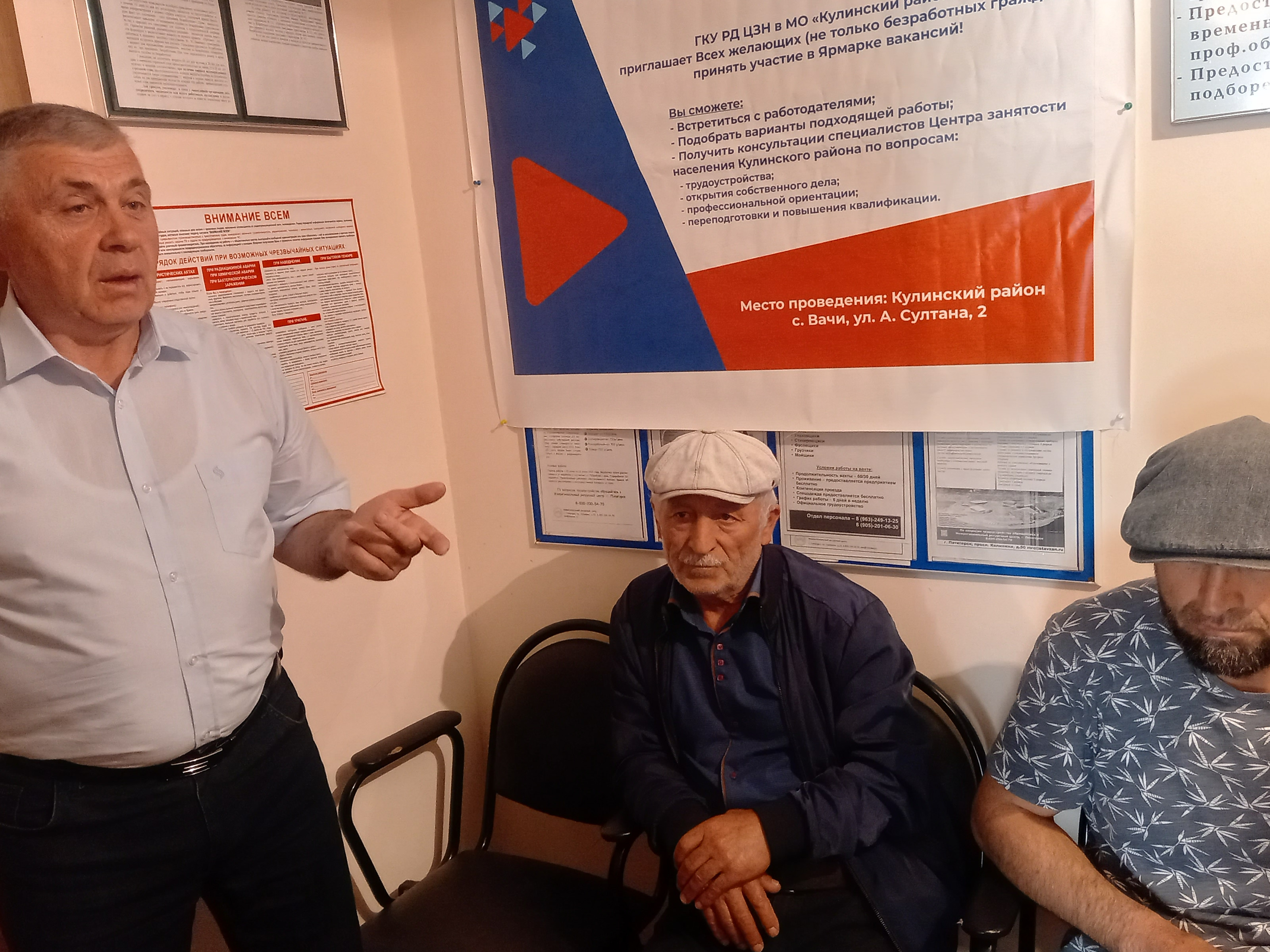 В понедельник 15 июля 2024 года в здании ГКУ РД ЦЗН в МО "Кулинский район" состоялась встреча заместителя главы администрации Кулинского муниципального района Давдиева Анатолия Сулеймановича с безработными и ищущими работу гражданами с целью разъяснения последним об условиях заключения контракта с минобороны Российской Федерации.