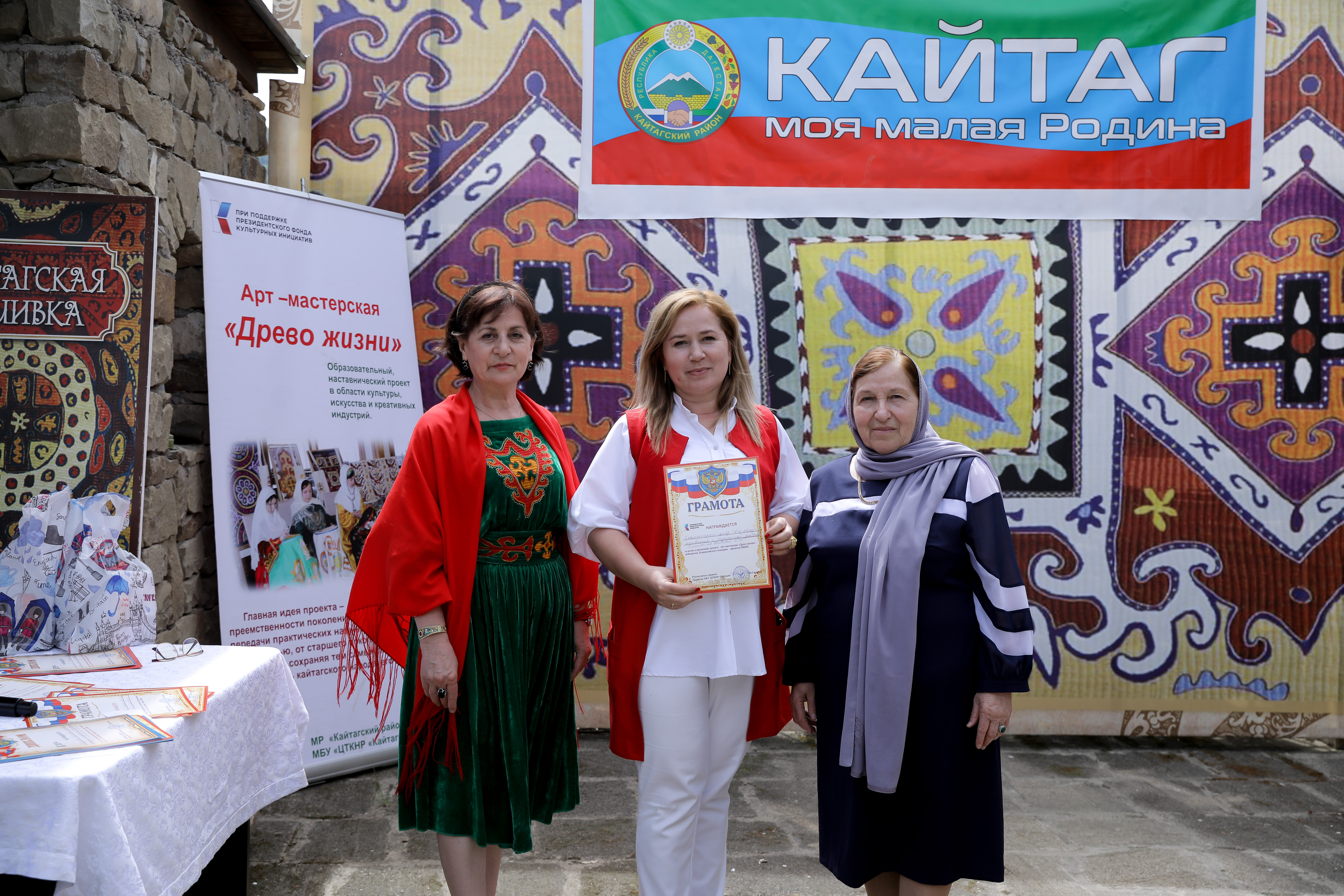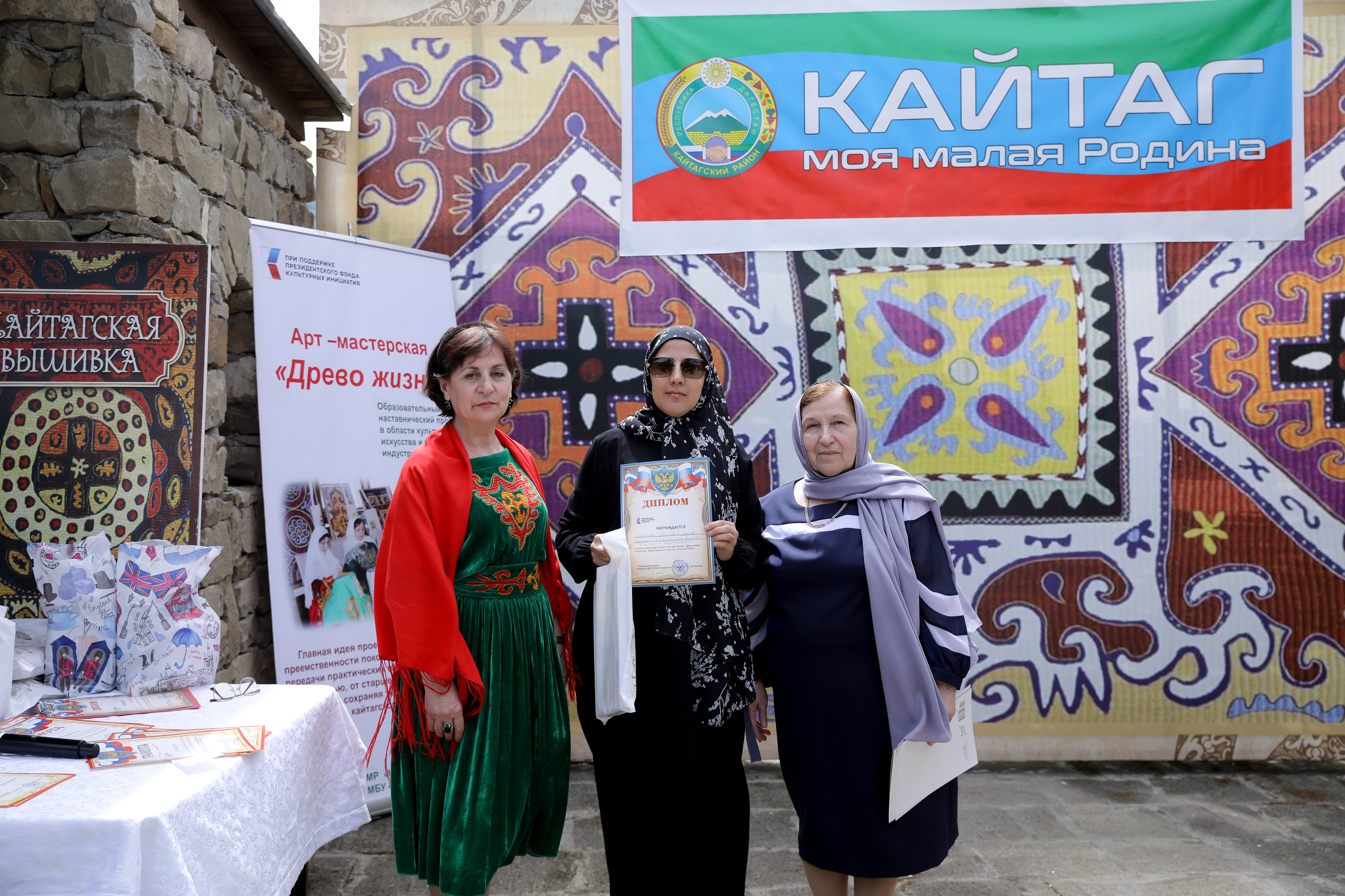 Во дворе Этно Центра Кайтаги провели концерт работники дома культуры Кайтагского района, после было награждение победителей: в номинации «Культурное наследие, Кайтагская вышивка, Кружковая работа», где наградили дипломом Хабиеву Тайбат – руководителя кружка по Кайтагской вышивке, Центра социального обслуживания населения Кайтагского района.