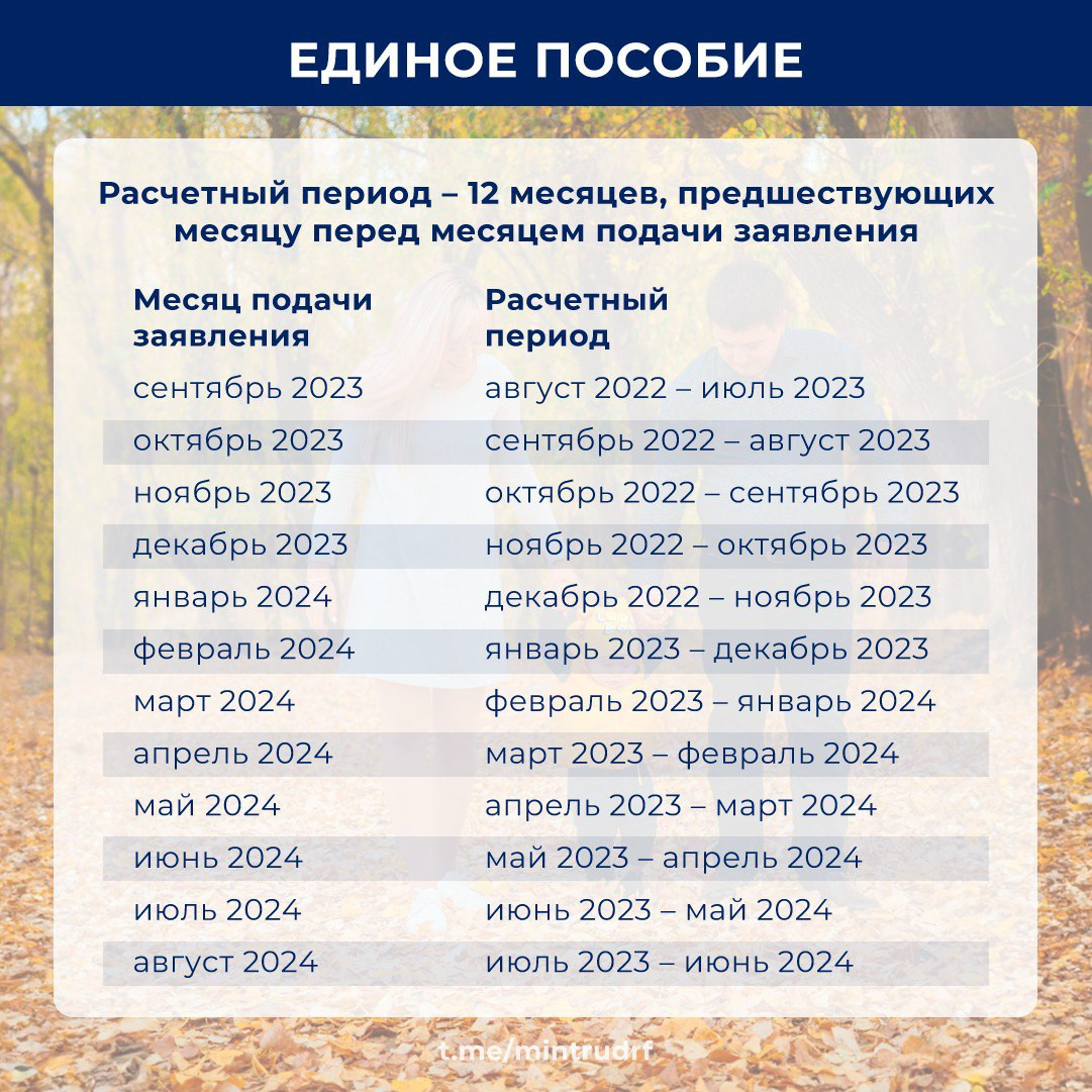 ? Расчетный период для единого пособия — 12 месяцев, предшествующих 1 месяцу перед месяцем подачи заявления.