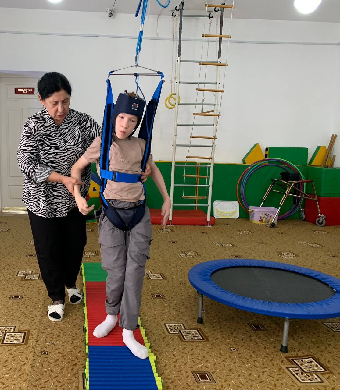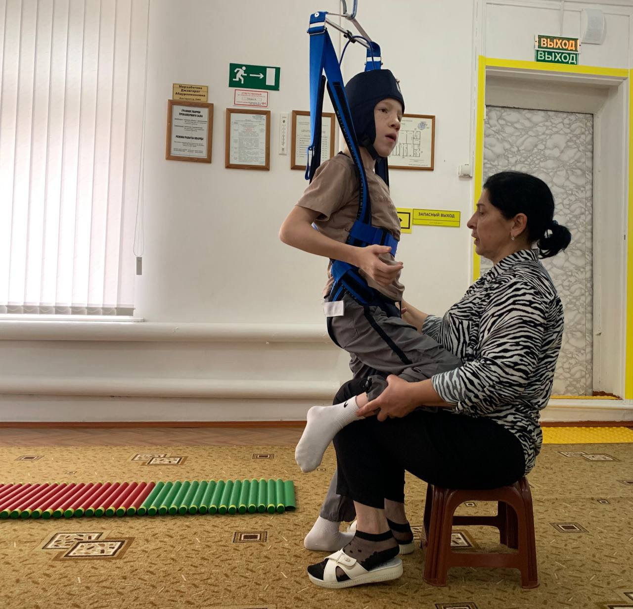 Врач ЛФК и инструктор ЛФК Алибекова Саида , проводят занятия на тренажере Гросса с детьми с ДЦП и с поражением опорно-двигательного аппарата .