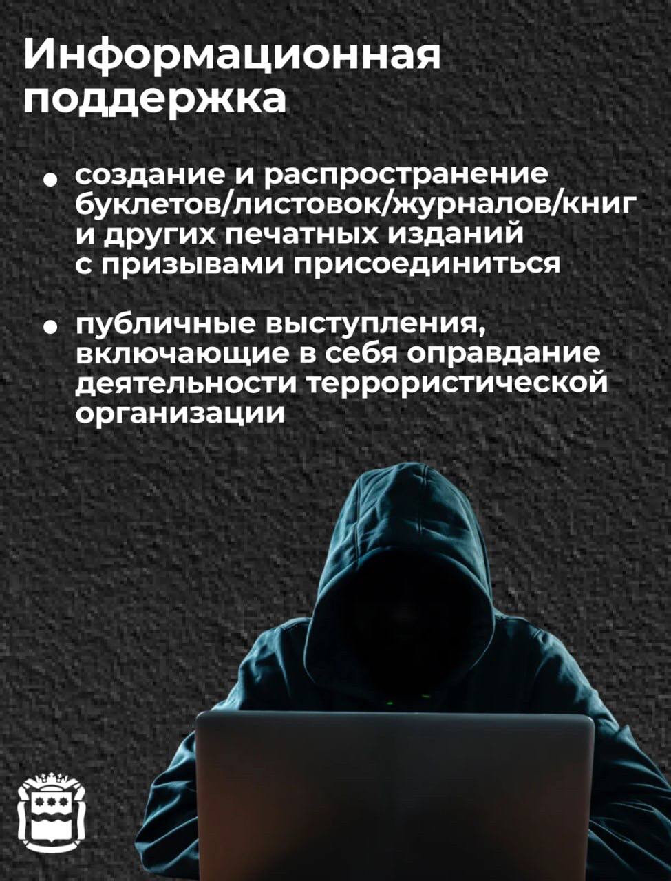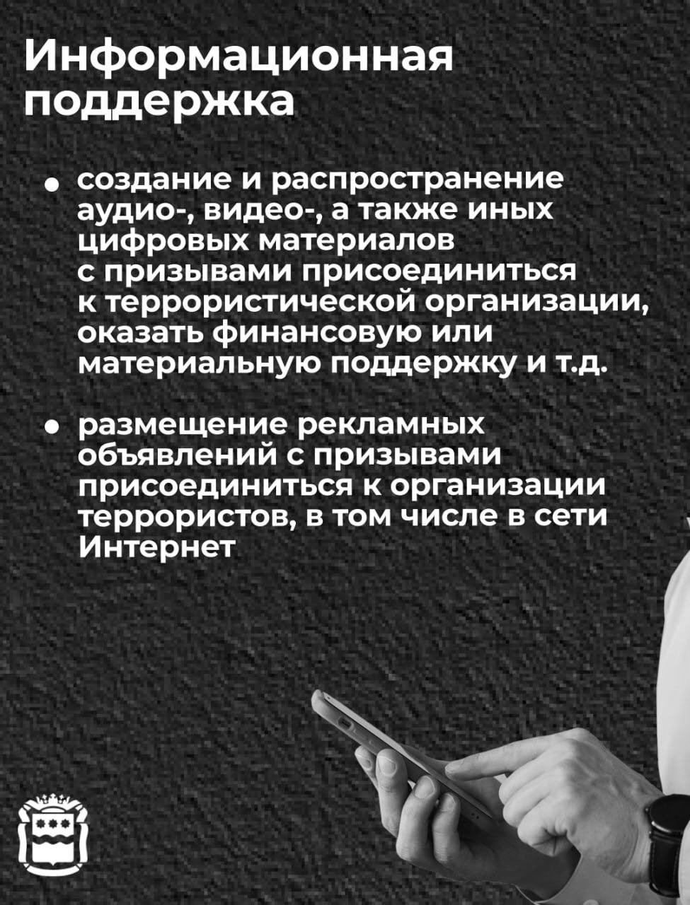 ❗️Террористическая деятельность становится еще более опасной при вовлечении в нее большого количества людей Уголовное наказание распространяется не только на тех, кто совершает террористический акт, но и на тех, кто создает условия для его реализации. Что такое пособничество терроризму и в каких формах оно проявляется, смотрите в наших карточках?