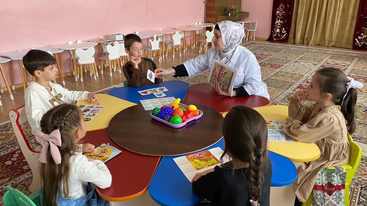 Занятие по развитию речи на тему «Овощи и фрукты - наши лучшие друзья» с использованием проблемно-игровой технологии проводят Байгинат Магомедова и Патимат Булатханова.