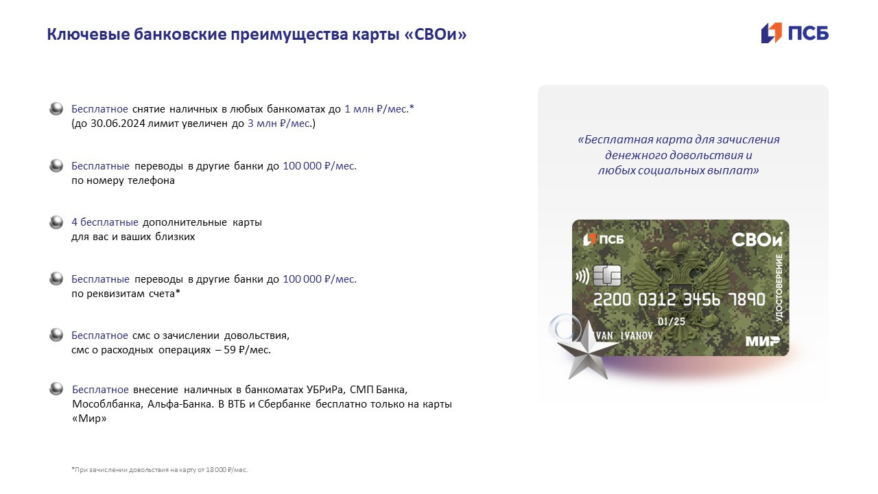 Удостоверение оформляется в виде пластиковой карты с электронным носителем информации и предоставляет возможность ветеранам боевых действий (членам семей погибших (умерших) ветераном боевых действий) получать социальные выплаты с банковскими преимуществами (бесплатные переводы по номеру телефона в другие банки до 100 000 рублей в месяц, бесплатное снятие наличных в любых банкоматах и др.)