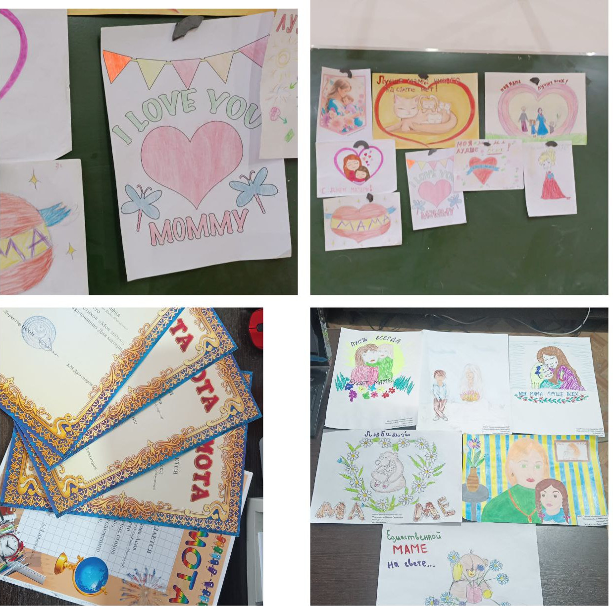 Дети подготовили яркие, интересные, творческие рисунки в честь праздника мамы. Они с трепетным и волнительным чувством подошли к работе и поэтому их рисунки получились яркими, красочными, разнообразными, но в каждом чувствовалась любовь к самому дорогому человеку на свете- к своей мамочке.