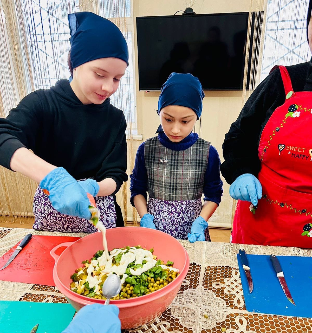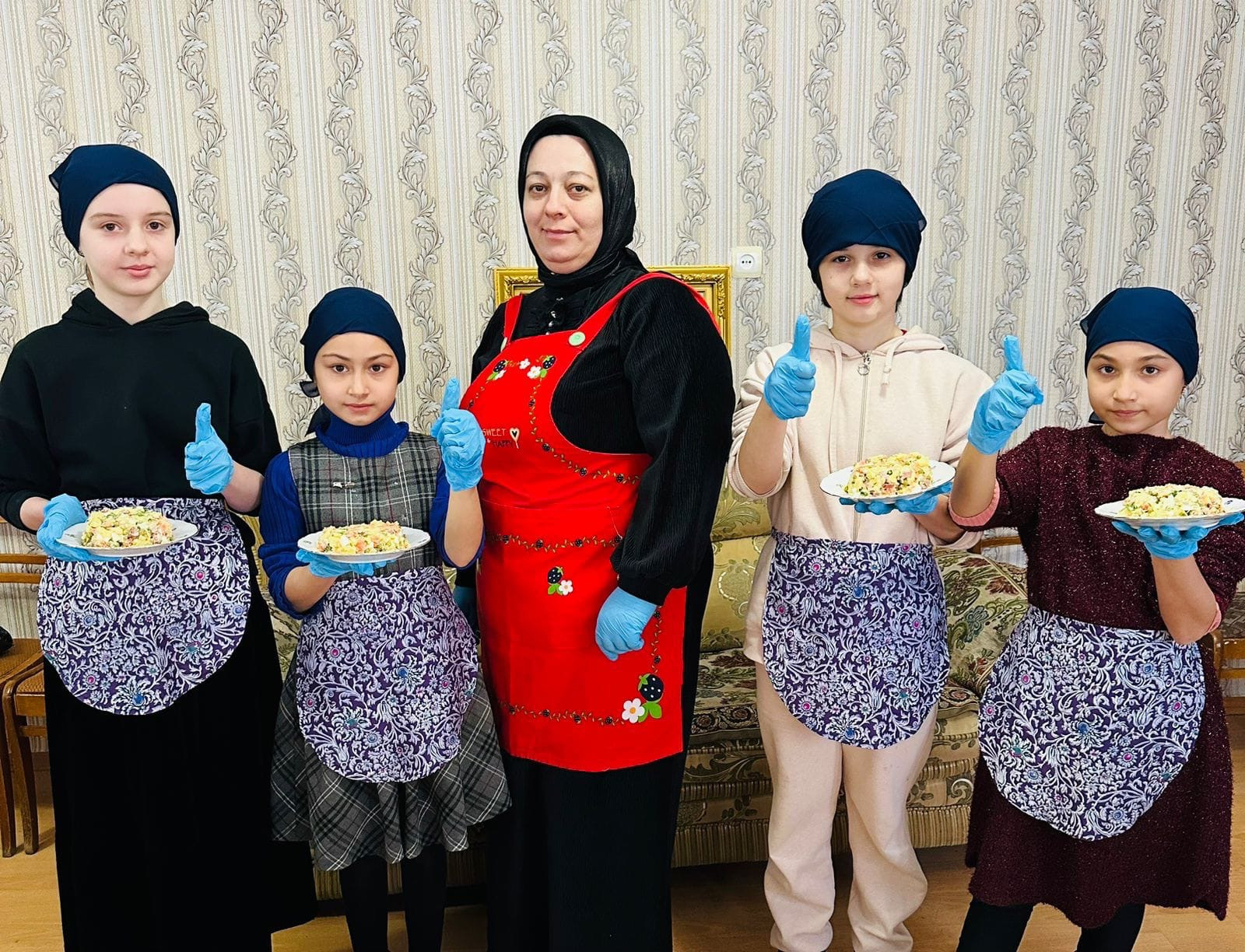 Провела обучающий, познавательный и вкусный мастер–класс специалист отдела семьи Тавмурзаева Седа. Она показала, как готовится салат «Оливье». Дети с огромным удовольствием включились в увлекательный процесс, не забыв предварительно помыть и обработать руки, а также надеть фартуки, перчатки и платочки. А затем, когда салат был приготовлен, девочки сервировали стол и организовали чаепитие.