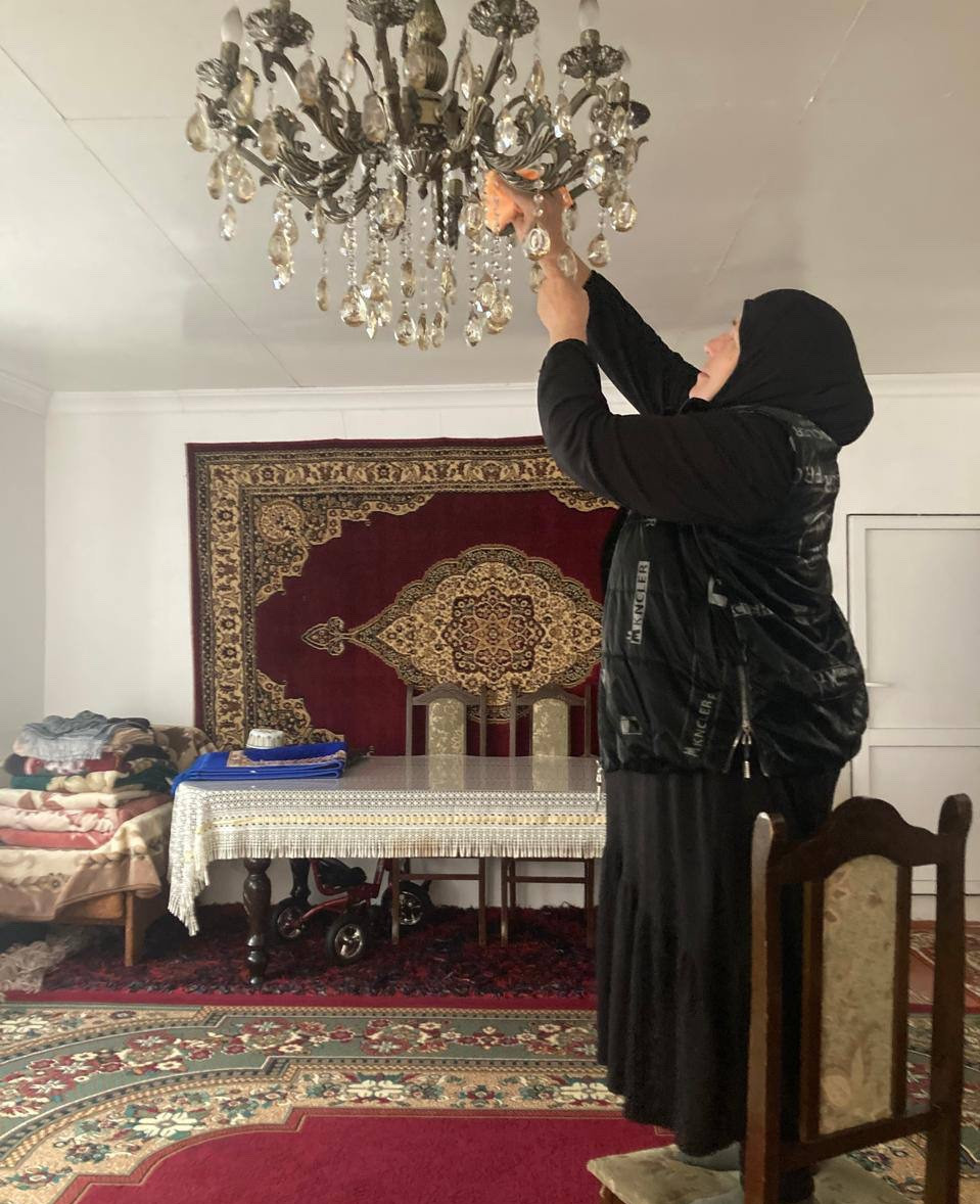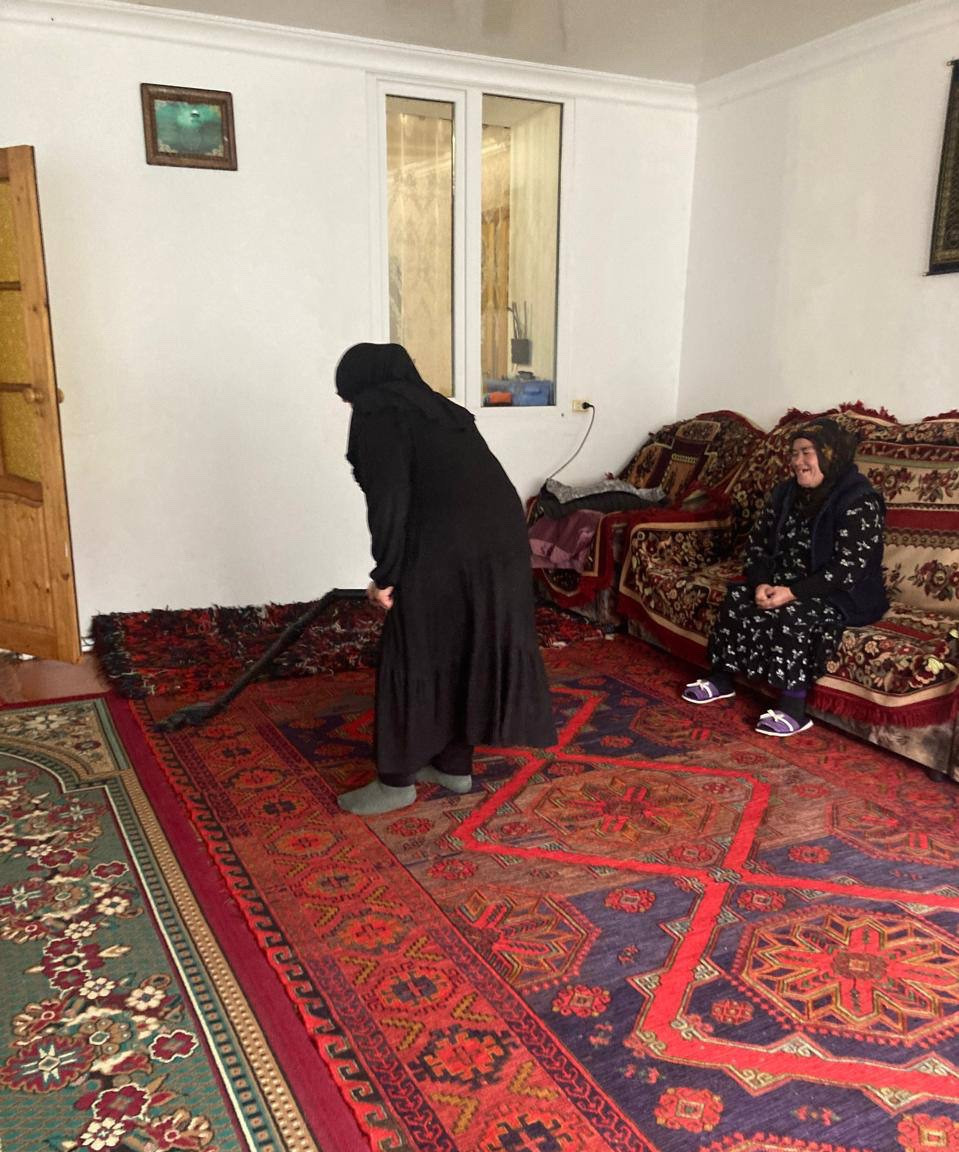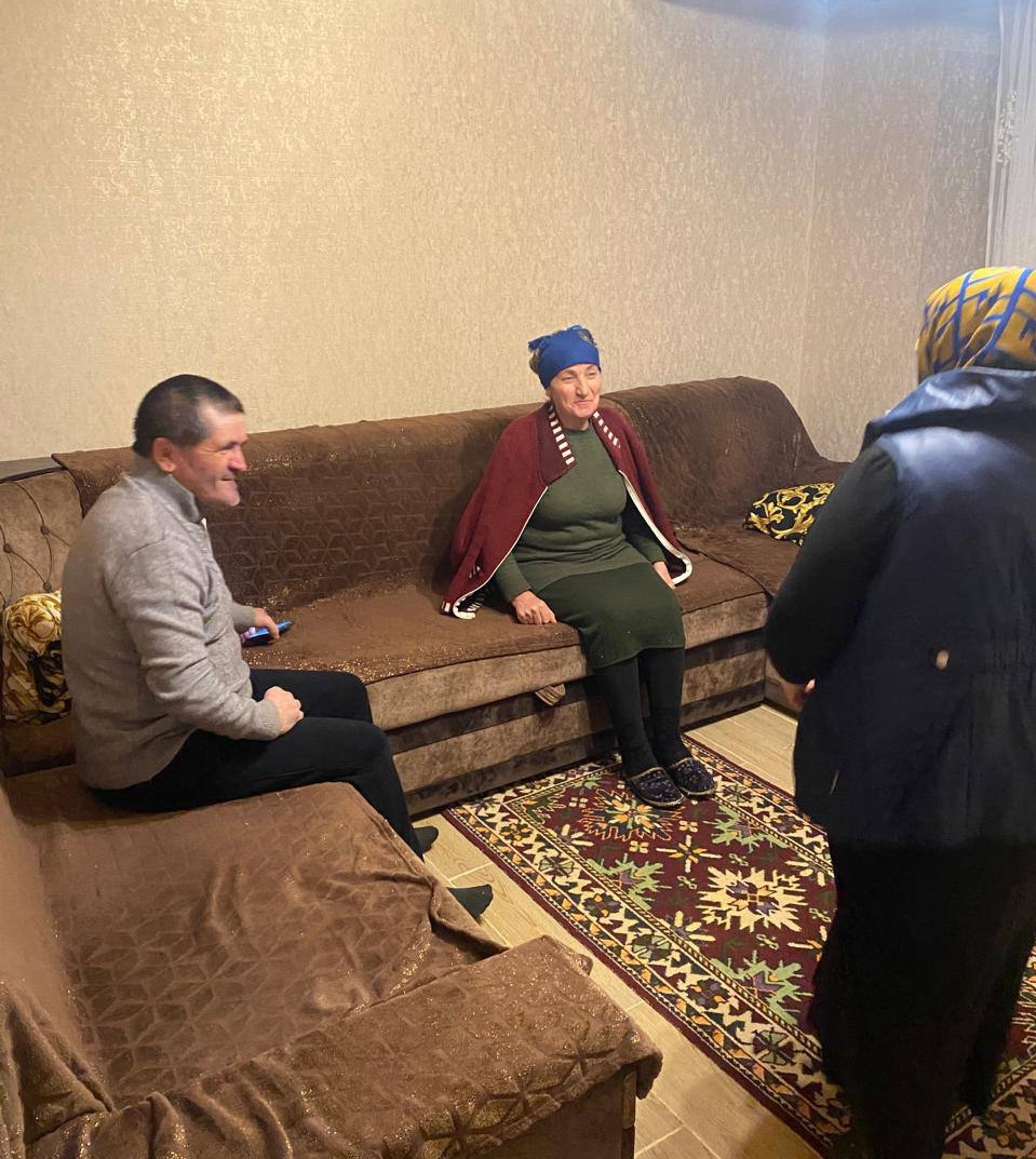 Социальные работники отделения социального обслуживания граждан пожилого возраста и инвалидов на дому КЦСОН Агульского района Джабарова Байранкиз и Алиева Байранкиз при исполнении служебных обязанностей по оказанию социально-бытовых услуг подопечным из с.Тпиг.