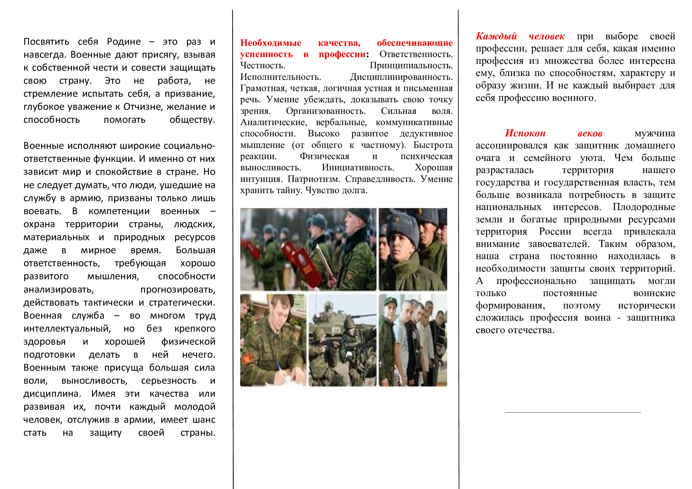 В целях обеспечения эффективной занятости молодежи, в том числе выпускников общеобразовательных организаций , оказания им содействия в самоопределении, реализации индивидуального потенциала и ориентирования их на выбор профессий, пользующихся перспективным спросом на рынке труда, повышения информированности учащихся о военных профессиях (специальностях), а также патриотического воспитания молодежи, Центром занятости населения была подготовлена памятка для молодежи "На пороге выбора профессий" ("Выпускнику школы (советы по выборе профессии").