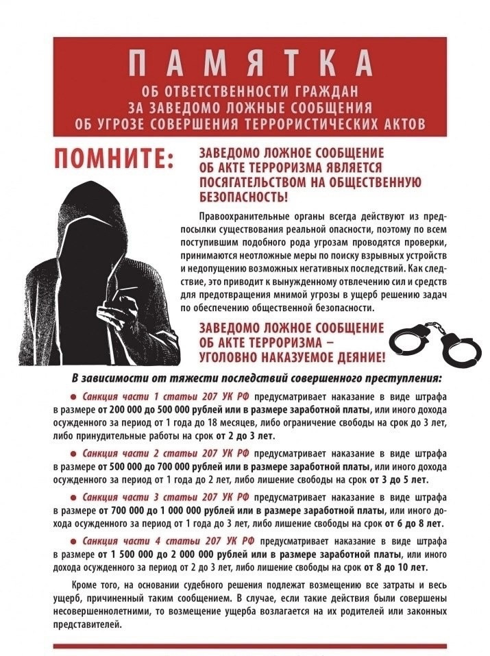 ПОМНИТЕ! ЗАВЕДОМО ЛОЖНОЕ СООБЩЕНИЕ ОБ АКТЕ ТЕРРОРИЗМА – УГОЛОВНО НАКАЗУЕМОЕ ДЕЯНИЕ!