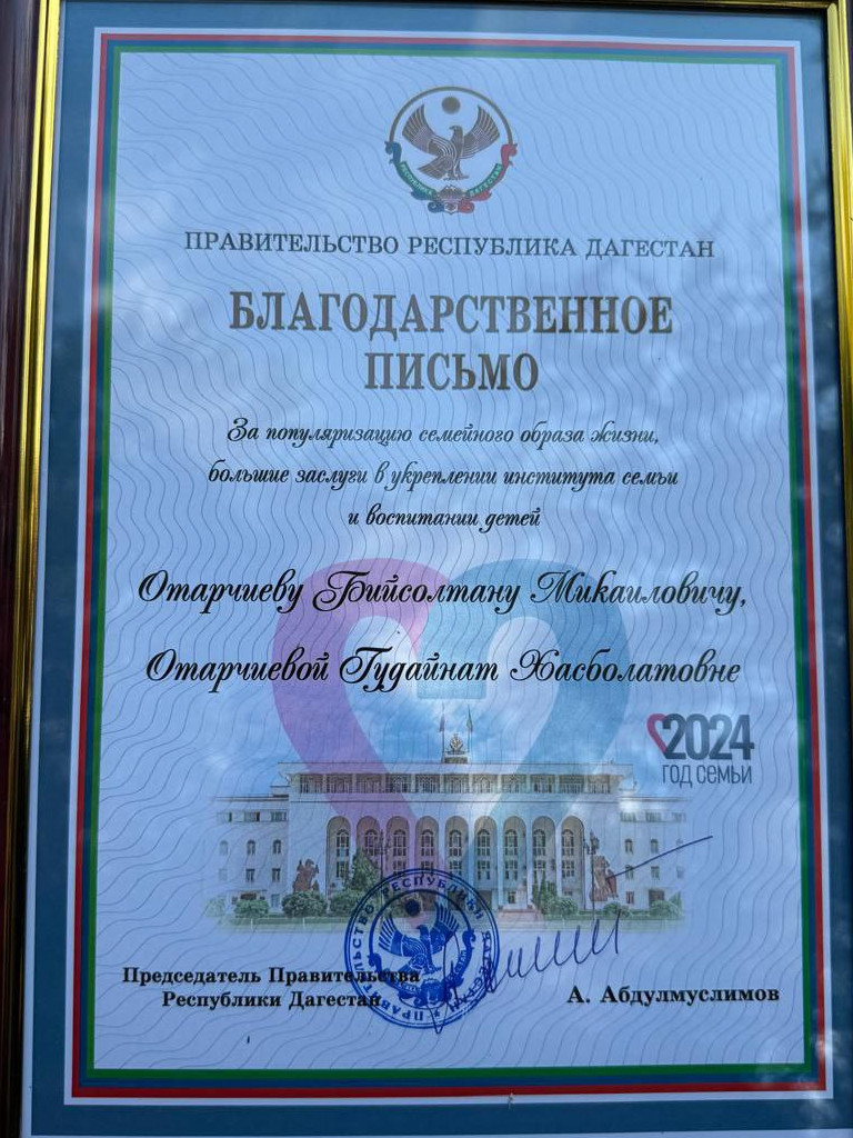 Председатель правительства Дагестана Абдулмуслим Абдулмуслимов наградил семью Отарчиевых благодарственным письмом и памятным подарком.