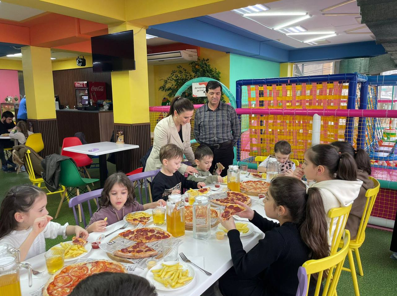 Детям была предоставлена возможность бесплатно провести время на различных аттракционах, а также накрыт праздничный стол.