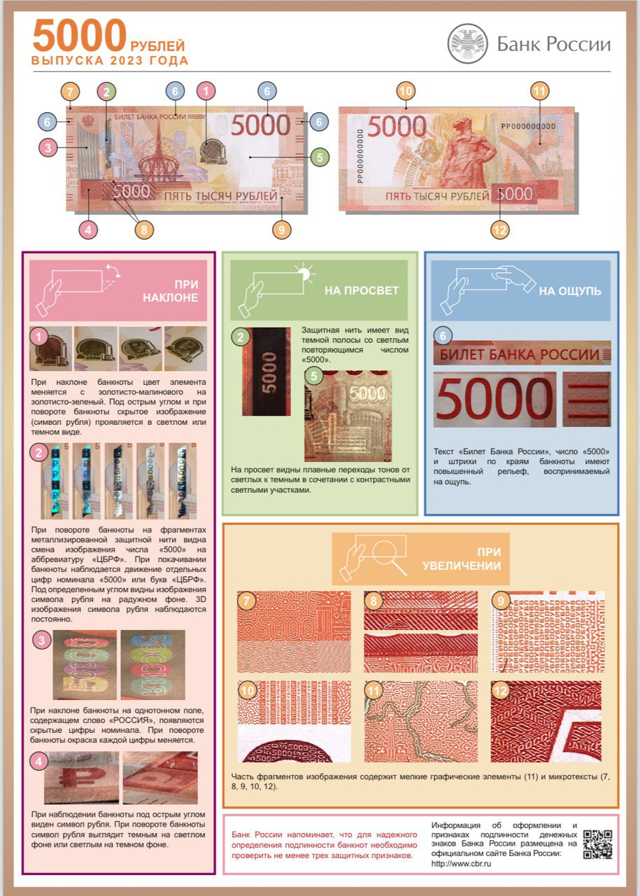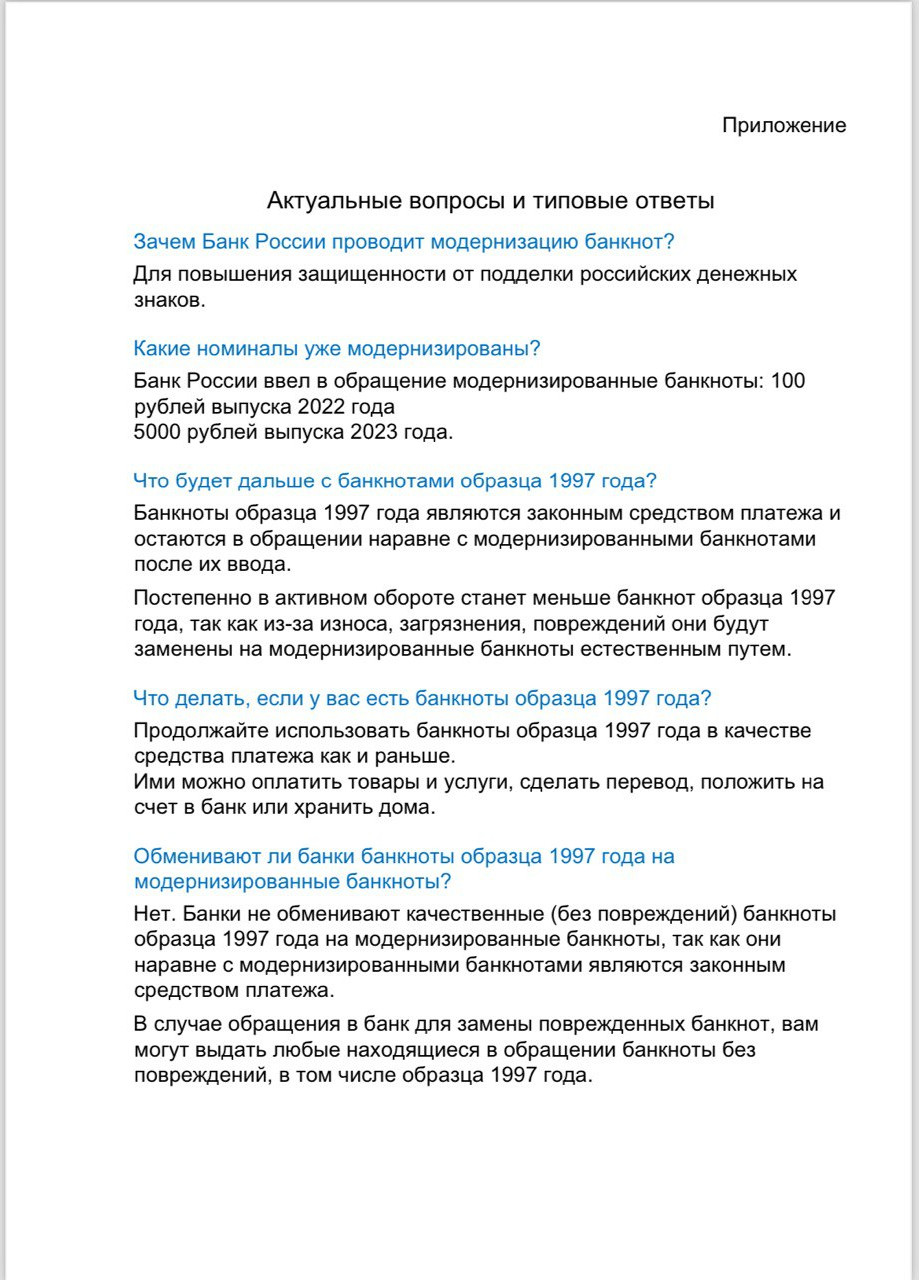Центральным банком России выпущены в обращение банкноты номиналом 100 рублей выпуска 2022 года и 5000 рублей выпуска 2023 года, в результате чего из Генеральной прокуратуры Российской Федерации поступила информация о появлении мошеннической схемы с обновленными купюрами. Так, мошенники предлагают заменить гражданам имеющиеся у них банкноты образца 1997 года на модернизированные банкноты и под этим предлогом совершают квартирные кражи с проникновением в жилища пенсионеров.