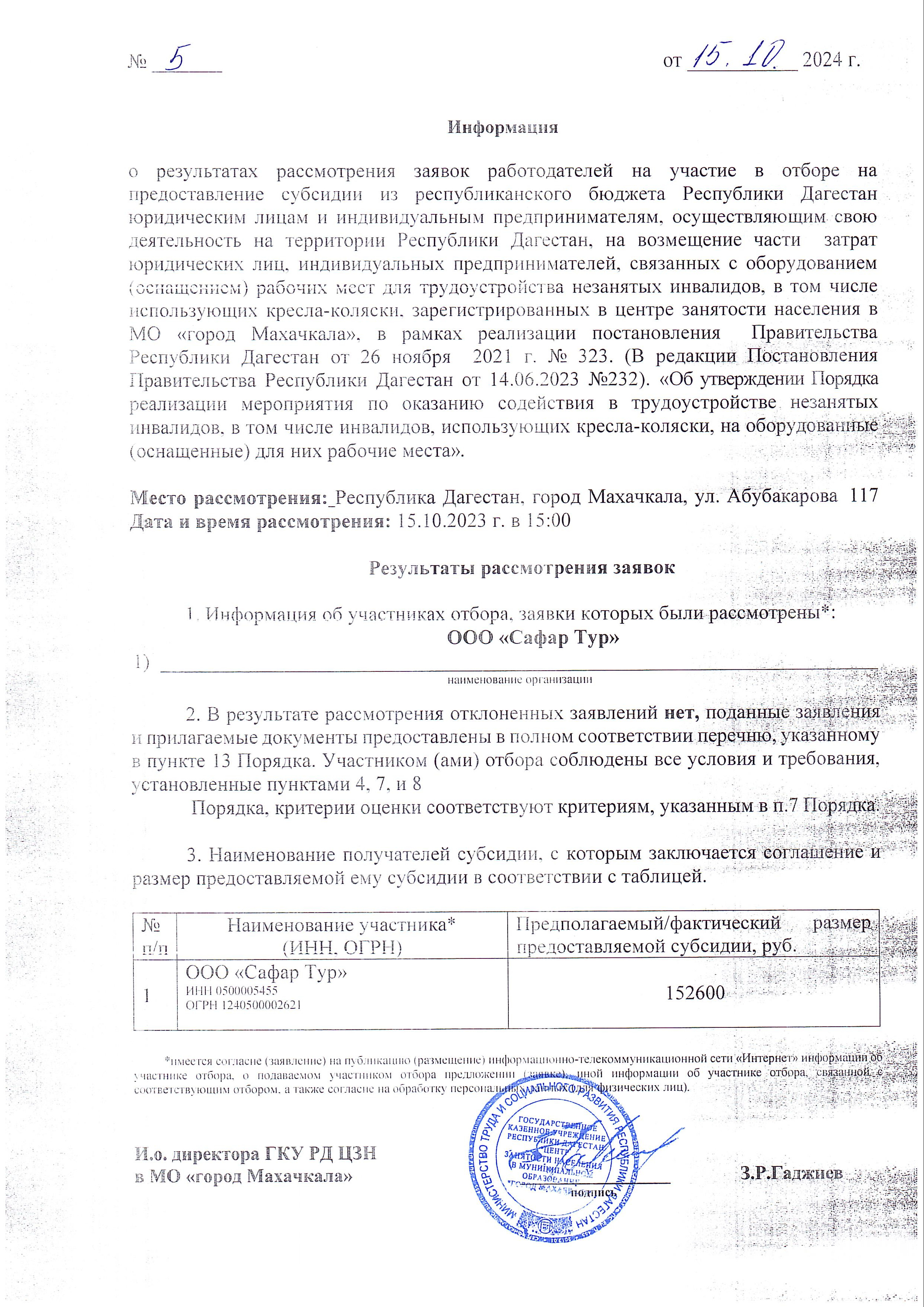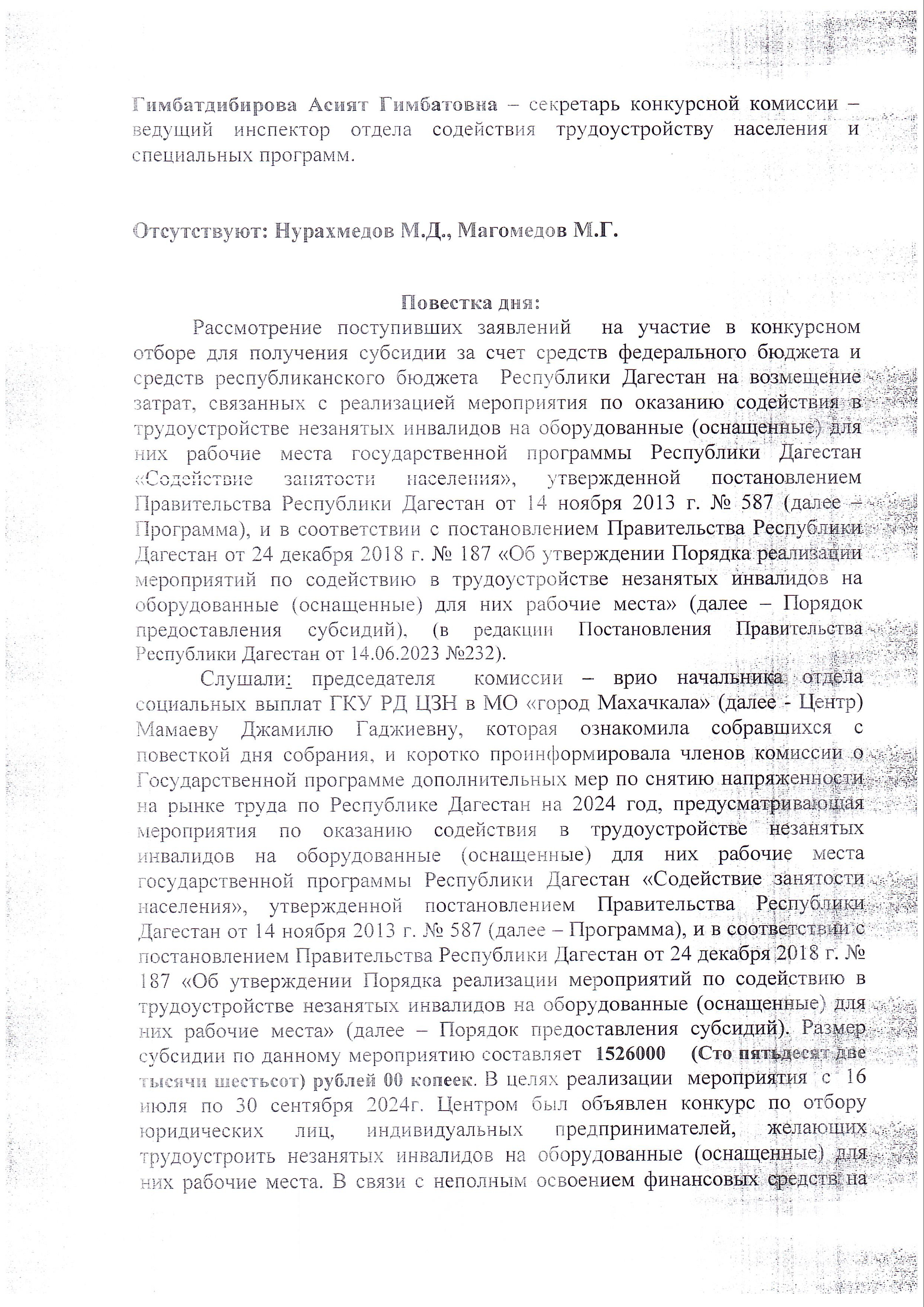 Протокол заседания конкурсной комиссии по отбору юридических лиц, индивидуальных предпринимателей для представления субсидий на возмещение затрат, связанных с реализацией мероприятия по оказанию содействия в трудоустройстве незанятых инвалидов на оборудованные (оснащенные) для них рабочие места.