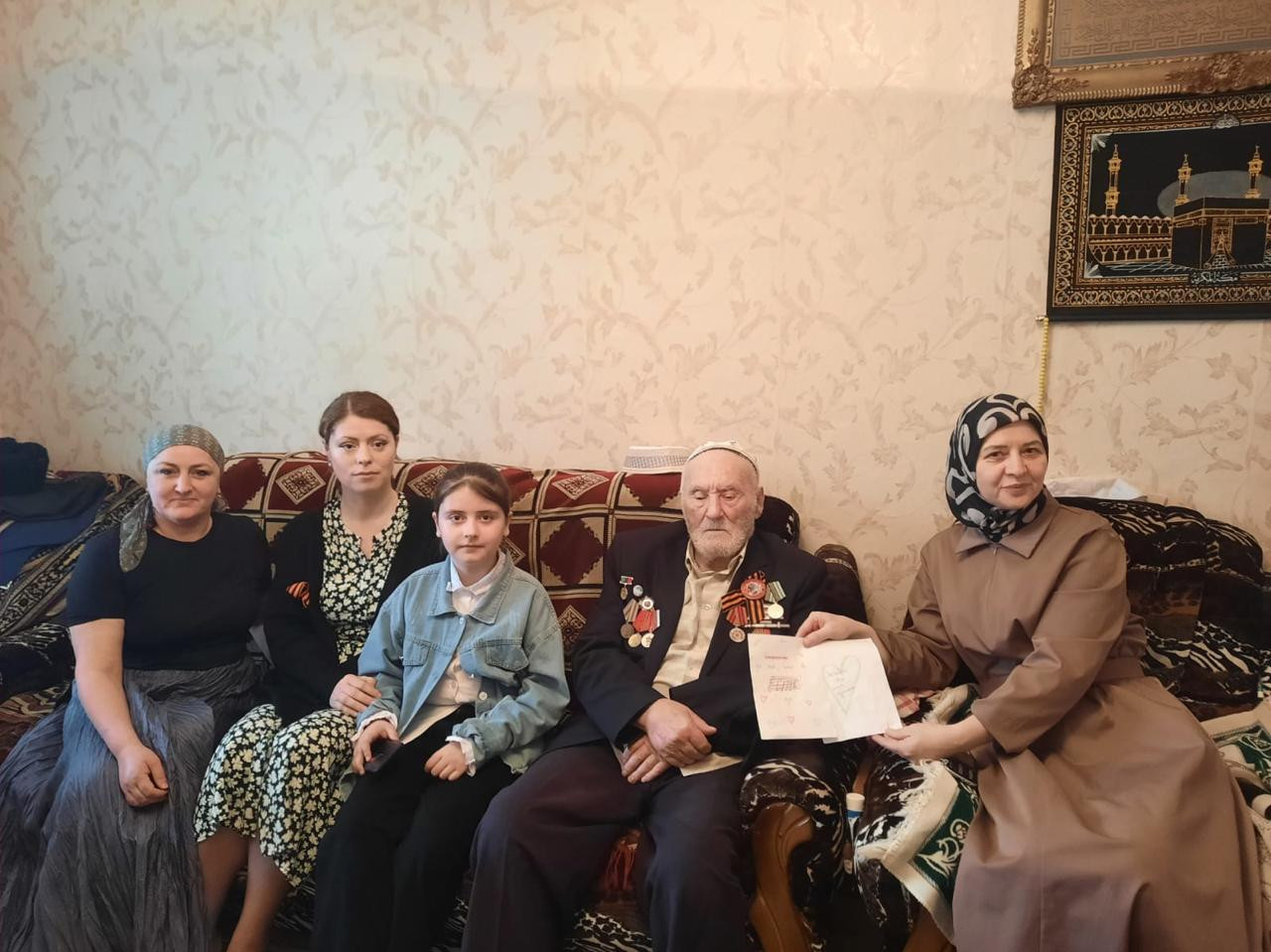 Ученица 8 «а» класса из Каспийского лицея №8 Мадина Ханнаева посвятила ветерану стихи собственного сочинения. Школьница стоя прочитала их ветерану и поблагодарила за Победу. Поздравить участника ВОВ с работниками Комплексного центра пришли также и другие учащиеся лицея №8 г.Каспийска.