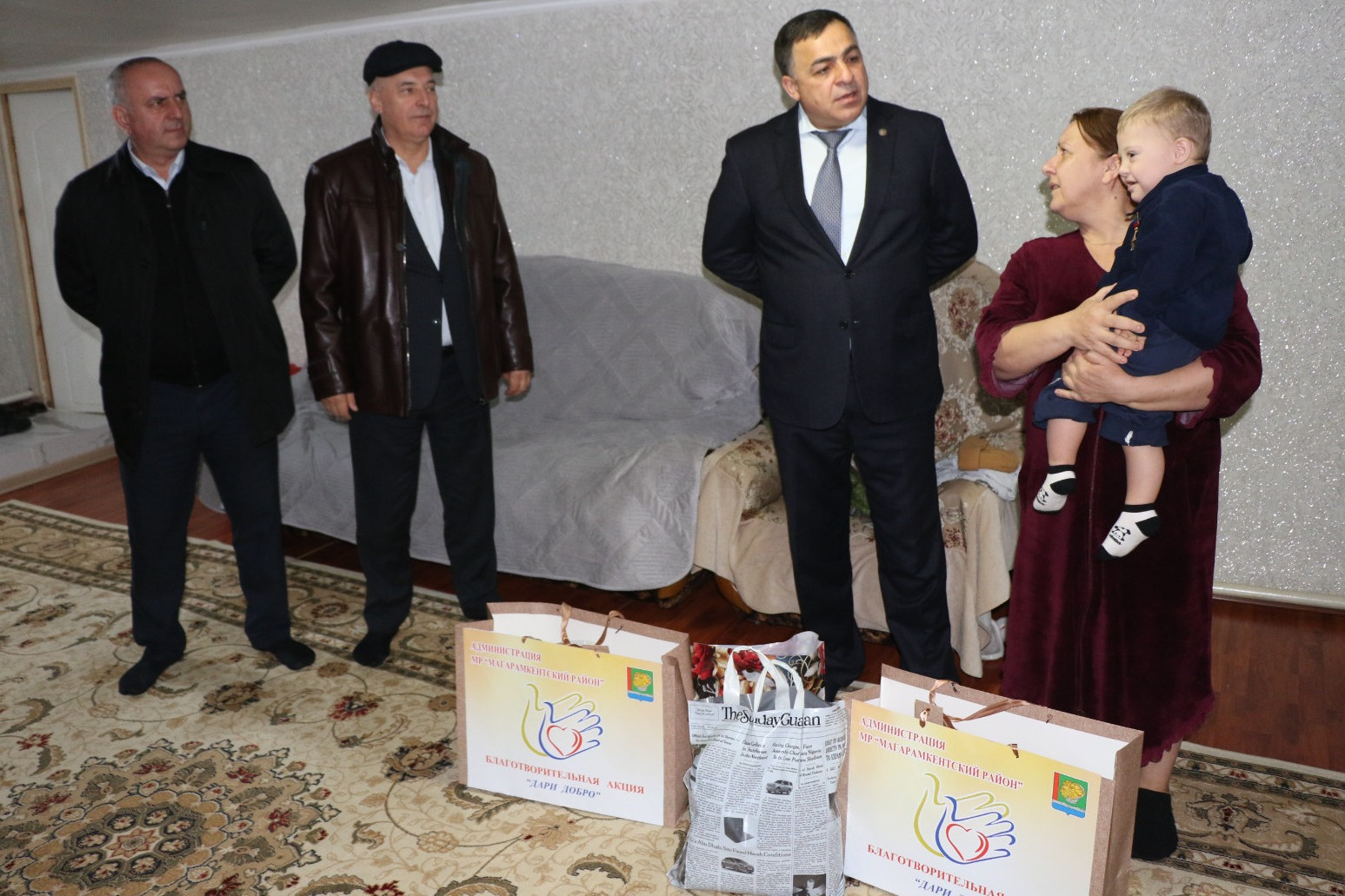 От социальных учреждений и администрации района семьям передали продуктовые наборы и подарки для детей.